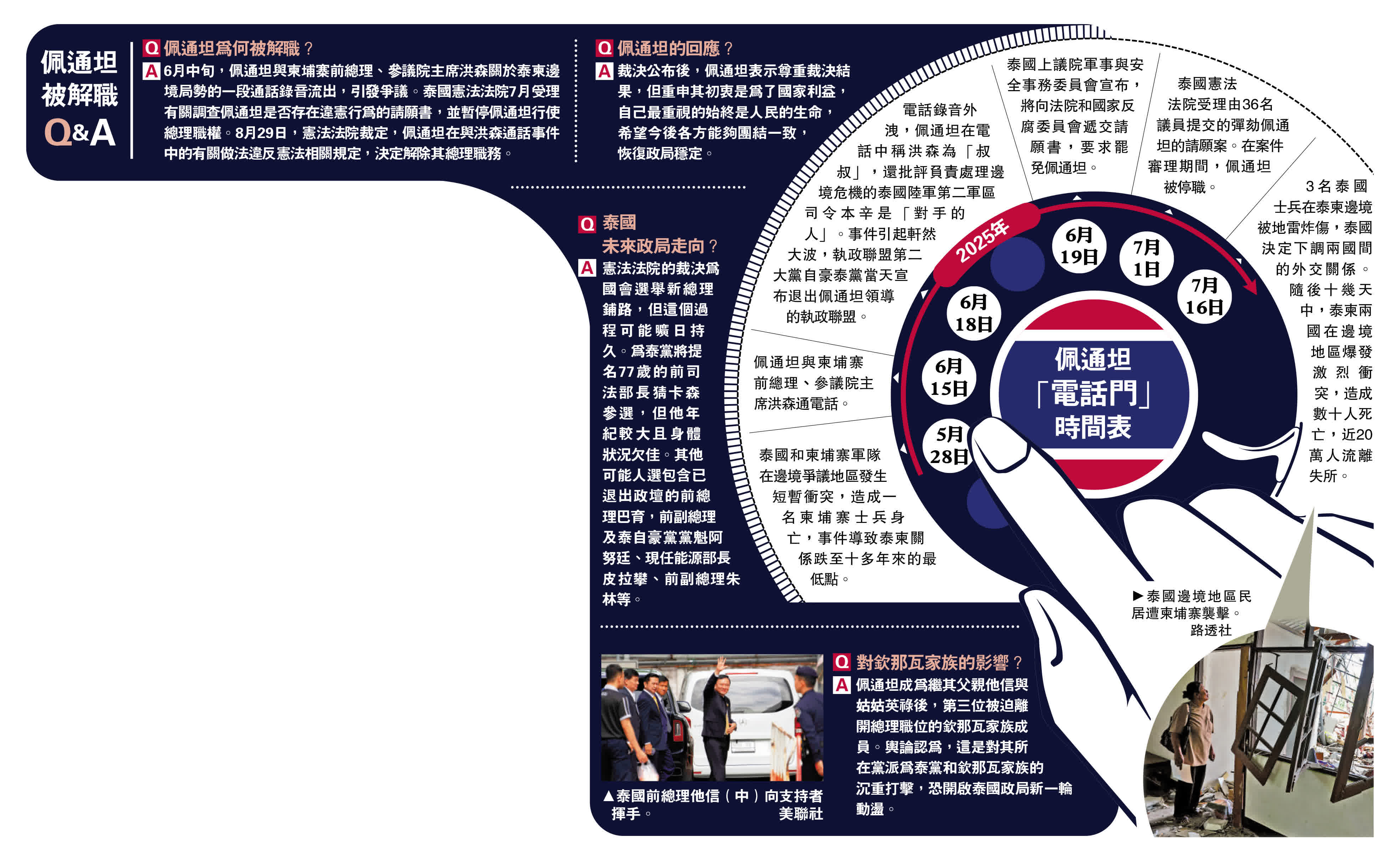 大公報報道,泰國憲法法院29日裁定,被停職總理佩通坦違反憲法相關規定,立即解除其總理職務。上任僅一年的佩通坦成為17年來第五位被憲法法院罷免的泰國總理。分析指,當前在泰國國會下議院中僅佔微弱多數的執政聯盟缺乏突出人選,或將經歷多輪投票方能選出新總理,泰國政局恐持續動盪。