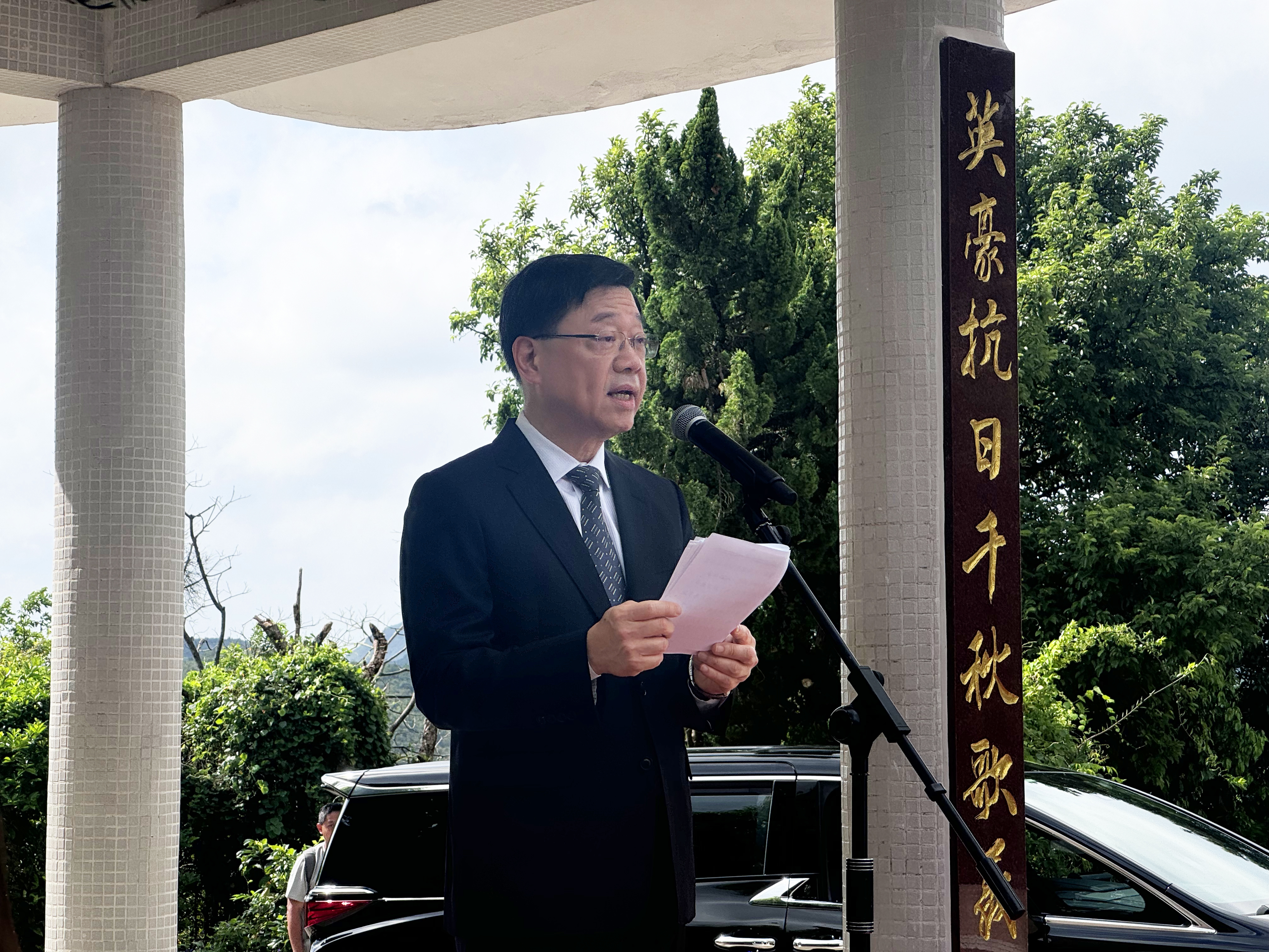 李家超致辭表示,紀念碑園是由港九大隊老戰士及西貢居民在80年代共同發起籌建,表揚和紀念英勇捐軀的抗日烈士,並於2020年獲國務院納入第三批《國家級抗戰紀念設施、遺址名錄》,意義重大。除斬竹灣抗日英烈紀念碑園外,香港還有多個抗戰遺址,特區政府會在這些地點加設紀念牌匾、史實資訊等,讓市民更全面認識抗戰歷史和抗戰勝利的重大意義。