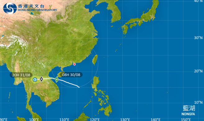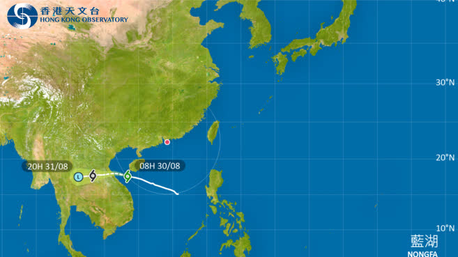 據中央氣象台消息,今晨(8月30日)8時前後,南海熱帶低壓加強為今年第14號颱風「藍湖」,中心附近最大風力8級(18米/秒)。預計,「藍湖」將以每小時25—30公里的速度向偏西方向移動,趨向越南中部沿海,有可能於今天傍晚前後在上述沿海登陸。