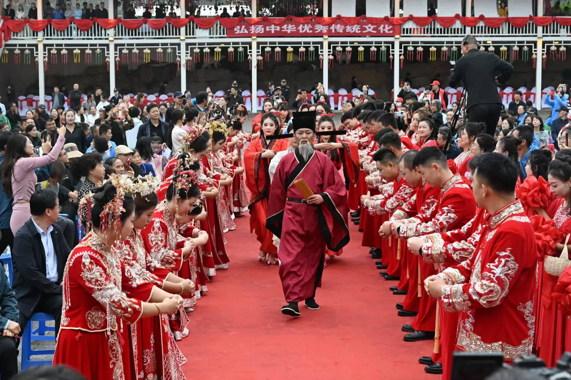 活動當天,百名身着精緻漢服的志願者,分別化身牛郎、織女等神話傳說人物,以及岐伯、李夢陽等隴東歷史名人,組成極具儀式感的傳統文化迎賓矩陣,用典雅的姿態迎接八方賓客。新人在心形簽到牆按下硃砂手印,共同完成「連理樹」手模,定格幸福瞬間。啟動儀式上,新人代表向全社會發出《抵制高額彩禮 倡樹婚戀新風》倡議,以自身行動傳遞「婚事新辦、婚事簡辦」的文明理念,引發在場觀眾強烈共鳴。