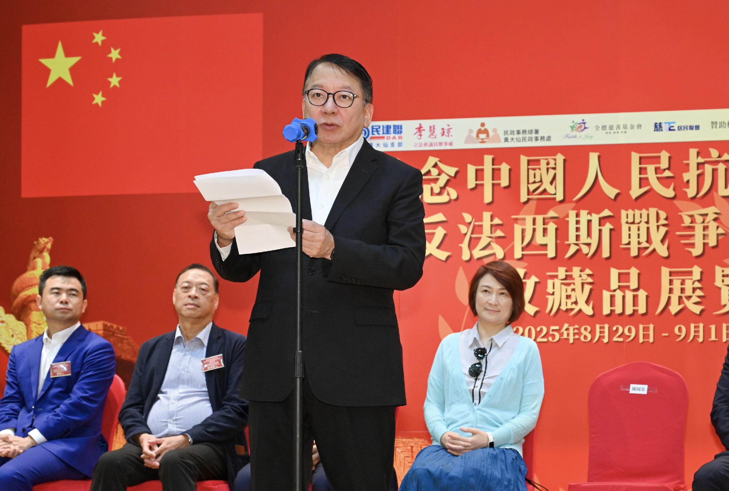 大公文匯全媒體報道,紀念中國人民抗日戰爭暨世界反法西斯戰爭勝利80周年收藏品展8月29日至9月1日在港舉辦。政務司司長陳國基、立法會議員李慧琼、中央人民政府駐香港特別行政區聯絡辦公室九龍工作部副部長郭長勇等嘉賓今日(8月30日)蒞臨現場。