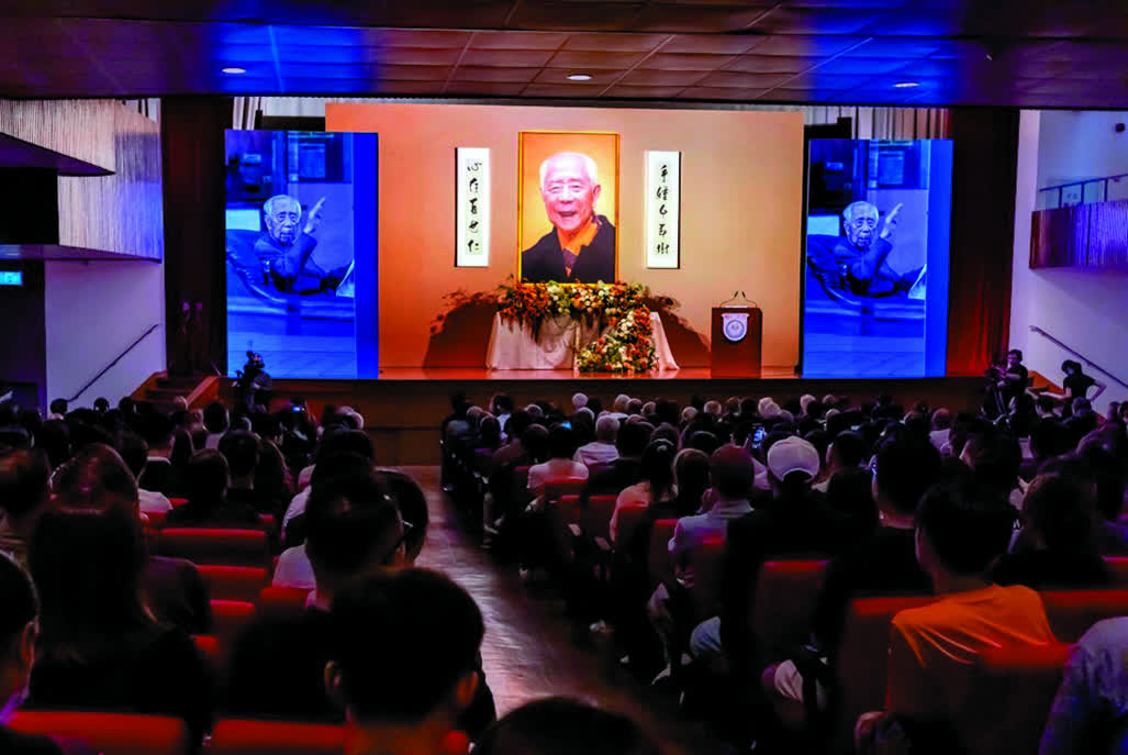 追思會主場館邵美珍堂台上掛着「手種千年樹、心存百世仁」對聯,多名校友、教職員和學生出席,校內多處亦安排追思會直播。