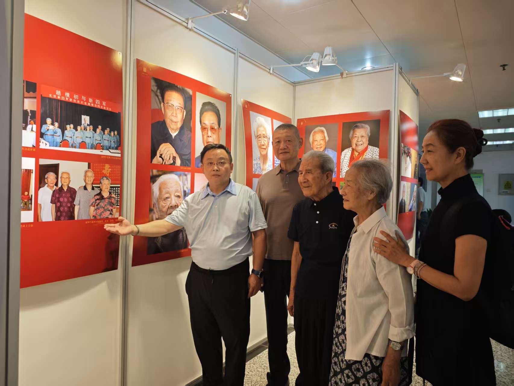 在展覽期間,記者遇到101歲的新四軍老戰士陸錦榮和夫人唐潔率全家一起前來觀展。陸錦榮,1924年出生,1938年,14歲的陸錦榮參加新四軍,相繼擔任勤務員、通信員。1939年,他被編入新四軍第1支隊第2團,這支部隊因屢立戰功被譽為「老虎團」。陸錦榮隨部隊與敵人英勇作戰,曾經歷過與敵人交火後7名戰友壯烈犧牲的場景,至今難忘。攝影師郭海鵬透露,陸錦榮、唐炎二人戰友情深,可謂抗戰「親兄弟」。2017年他為陸錦榮、唐炎等四位新四軍老戰士拍攝的合影中,現在僅有陸老健在。照片中的人物還有唐潔的二哥唐炎、二嫂盛林、三哥唐本。唐潔說:她和陸錦榮就是二哥唐炎介紹的。