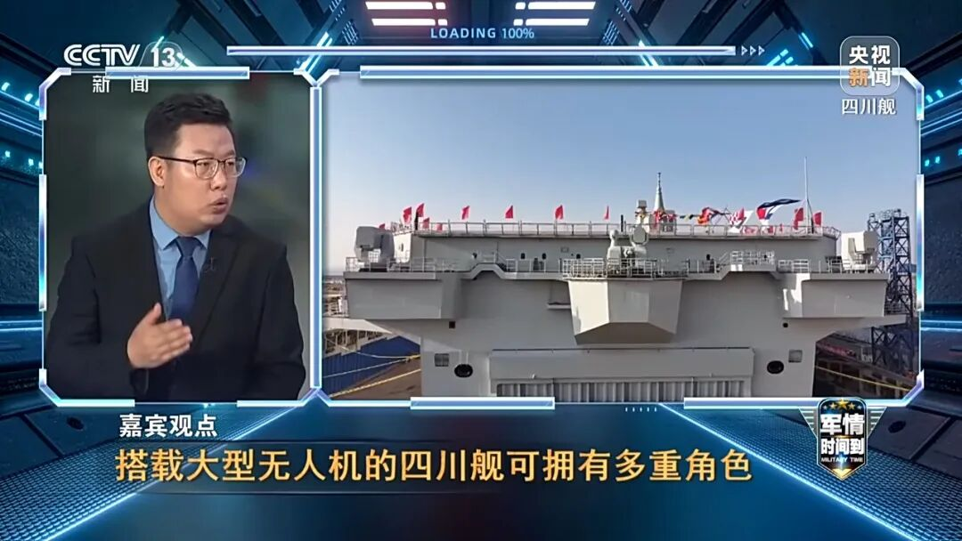 主持人勞春燕:去年年底,076型兩棲攻擊艦四川艦下水了。從外觀上就可以看到,四川艦配了電磁彈射裝置,四川艦未來是要彈射大型的無人機嗎?