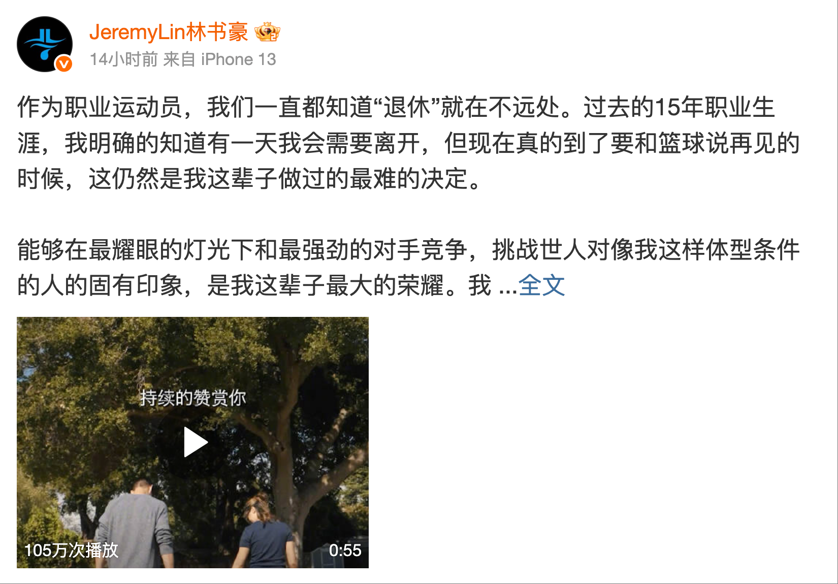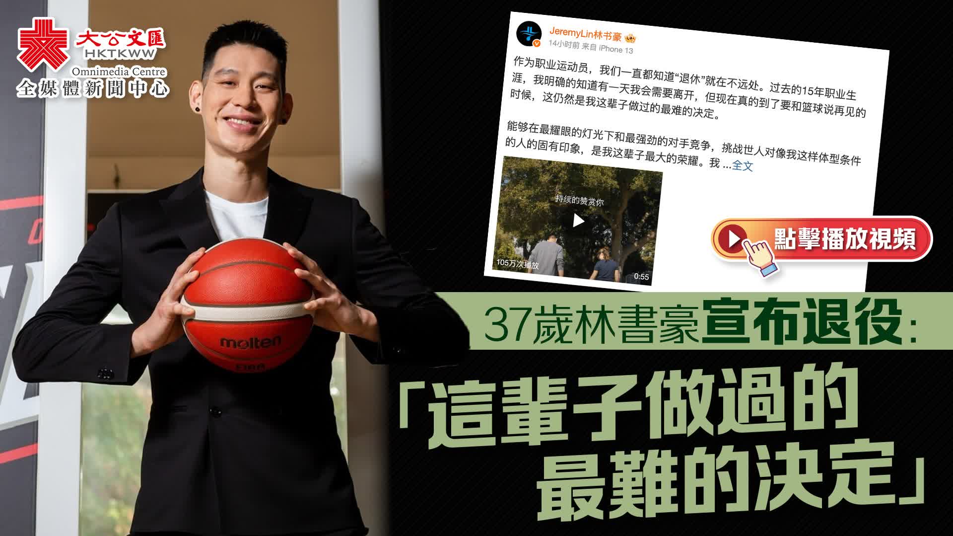 大公文匯全媒體報道,37歲前NBA球星林書豪,今日(31日)在社交平台宣布退役,結束15年的職業籃球員生涯。他在帖文中稱「(退役)仍然是我這輩子最難的決定」,但也明白「真的到了要和籃球說再見的時候」,並感謝多年相隨相伴的球迷。