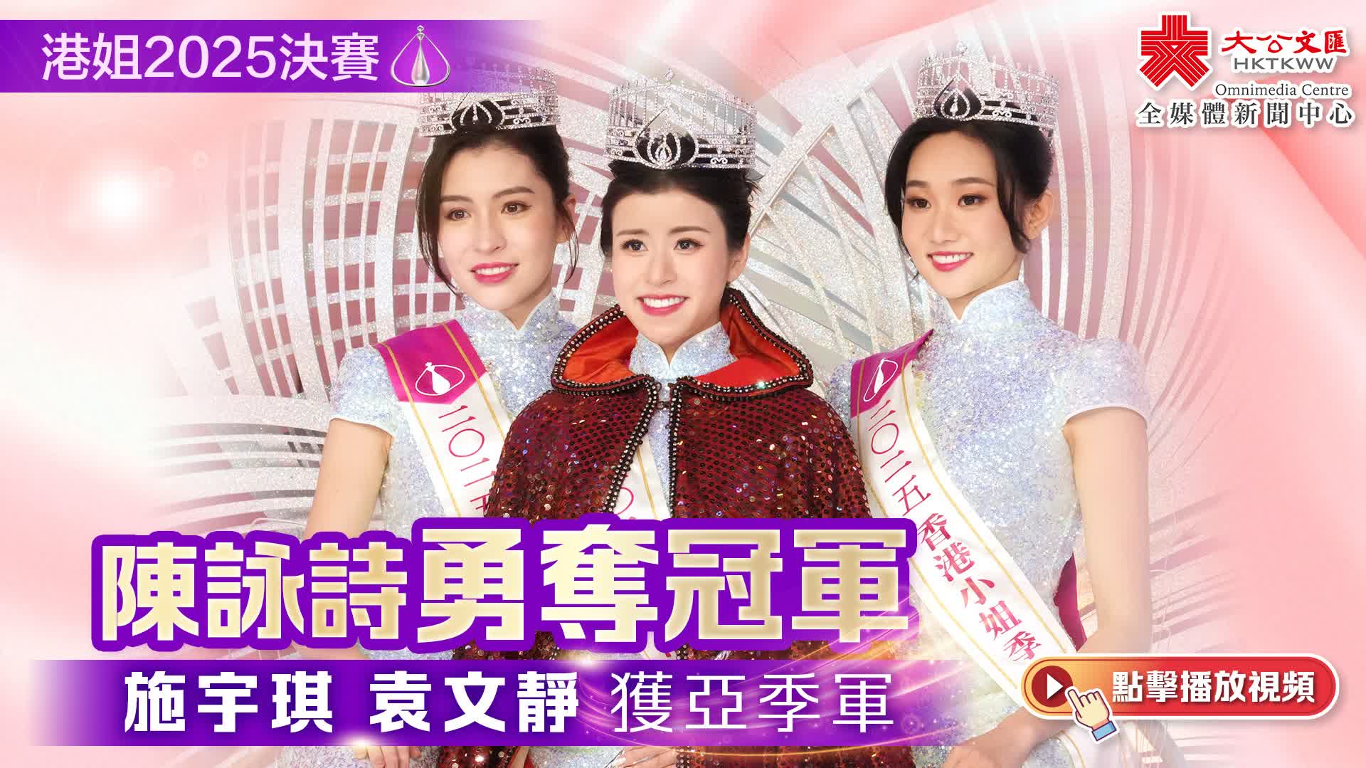 大公文匯全媒體報道,《2025香港小姐競選》今晚(31日)舉行決賽,14名候選佳麗競選冠、亞、季軍,以及最上鏡小姐、友誼小姐等獎項,展現香港女性的智慧與魅力。最終,9號陳詠詩奪得冠軍,7號施宇琪獲得亞軍,13號袁文靜獲季軍。1號李尹嫣當選友誼小姐及最上鏡小姐。