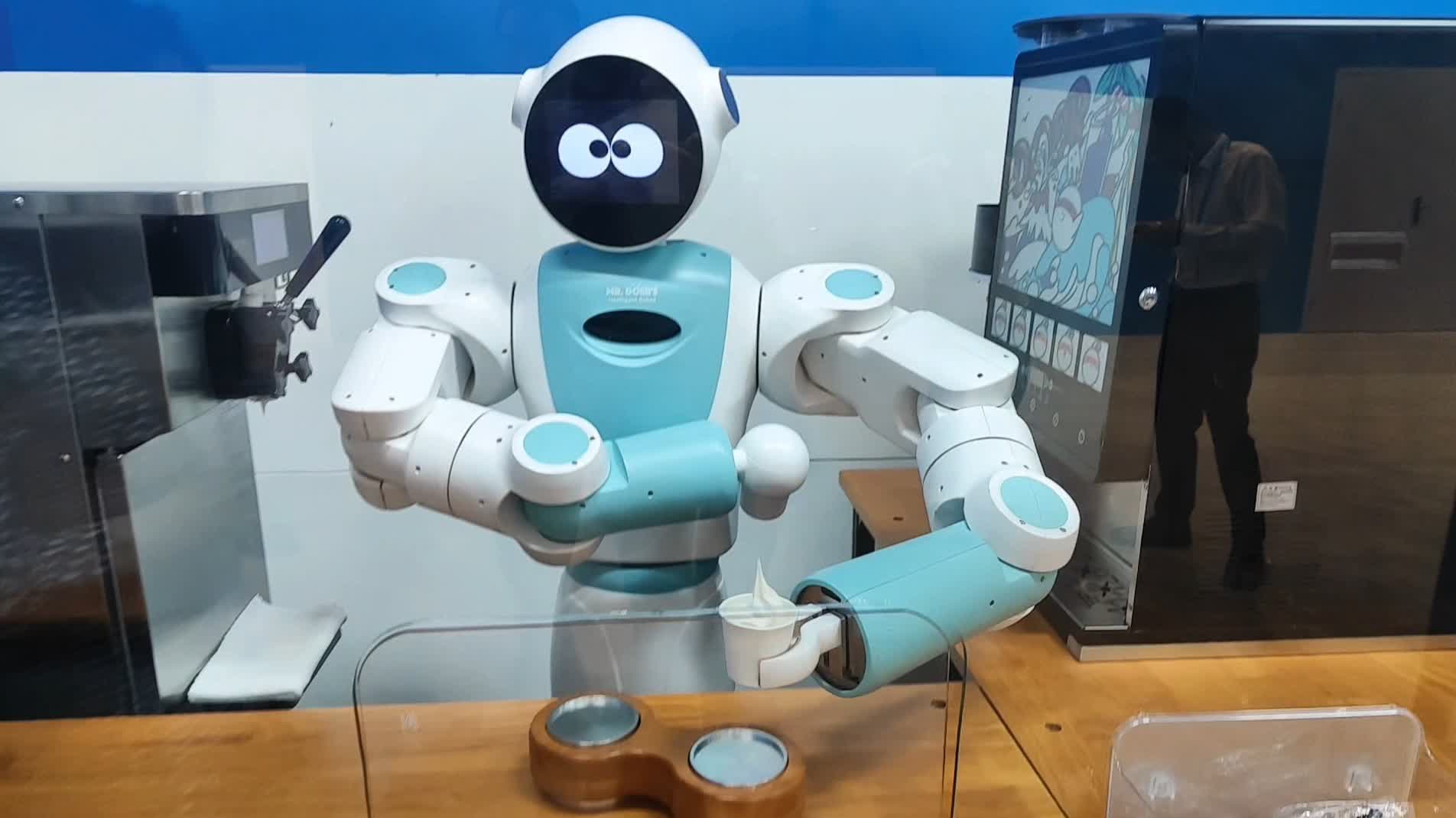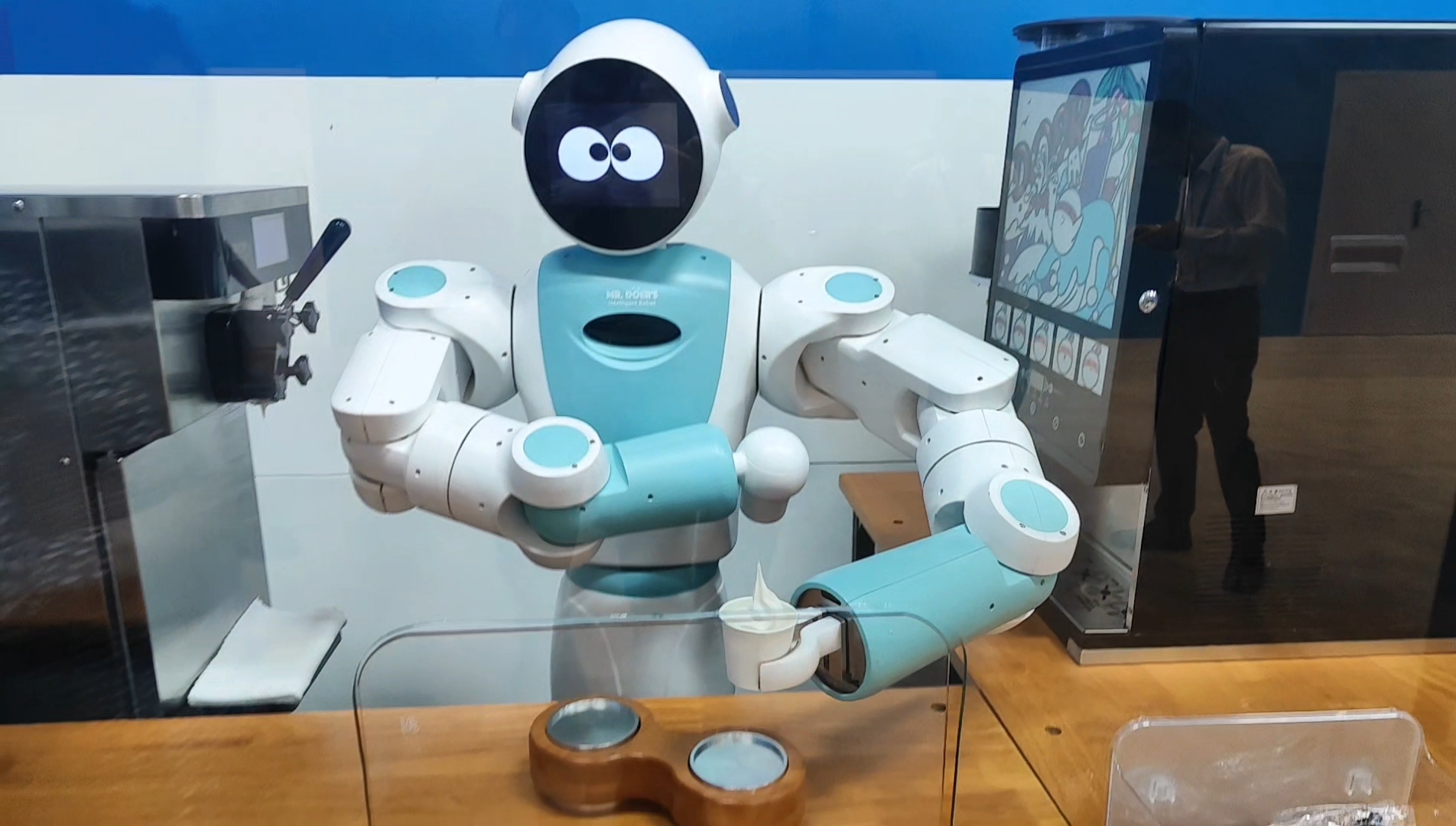 機器人所屬公司工作人員介紹,豆二機器人之所以能高效、精準地完成製作,得益於其背後的先進技術。它通過AI+雙臂協作系統實現冰淇淋等的無人化製作,結合視覺識別與自修復技術,保障食品安全,讓記者們吃得安心。此外,它還支持語音對話、人臉識別及偏好記憶功能,用戶首次消費後,下次便能享受個性化服務。在無人購買時,豆二機器人還會通過舞蹈賣萌等趣味動作吸引顧客,為緊張忙碌的新聞中心增添不少輕鬆氛圍。