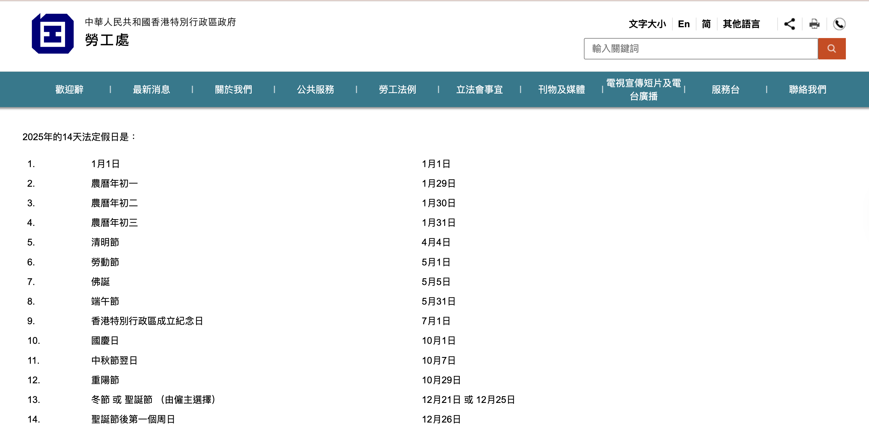 香港每年設有多個法定公眾假期,不採用調休制度,假期分散但不易連休,以下是2025的法定假期: