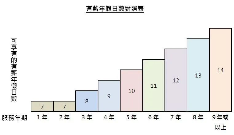 根據《僱傭條例》,受僱滿12個月的全職員工可享有薪年假,其天數會隨年資遞增。僱員每年可享的有薪年假日數按受僱年資由首兩年每年7日,之後每年加1日,遞增至最高14日。具體參考如下:
