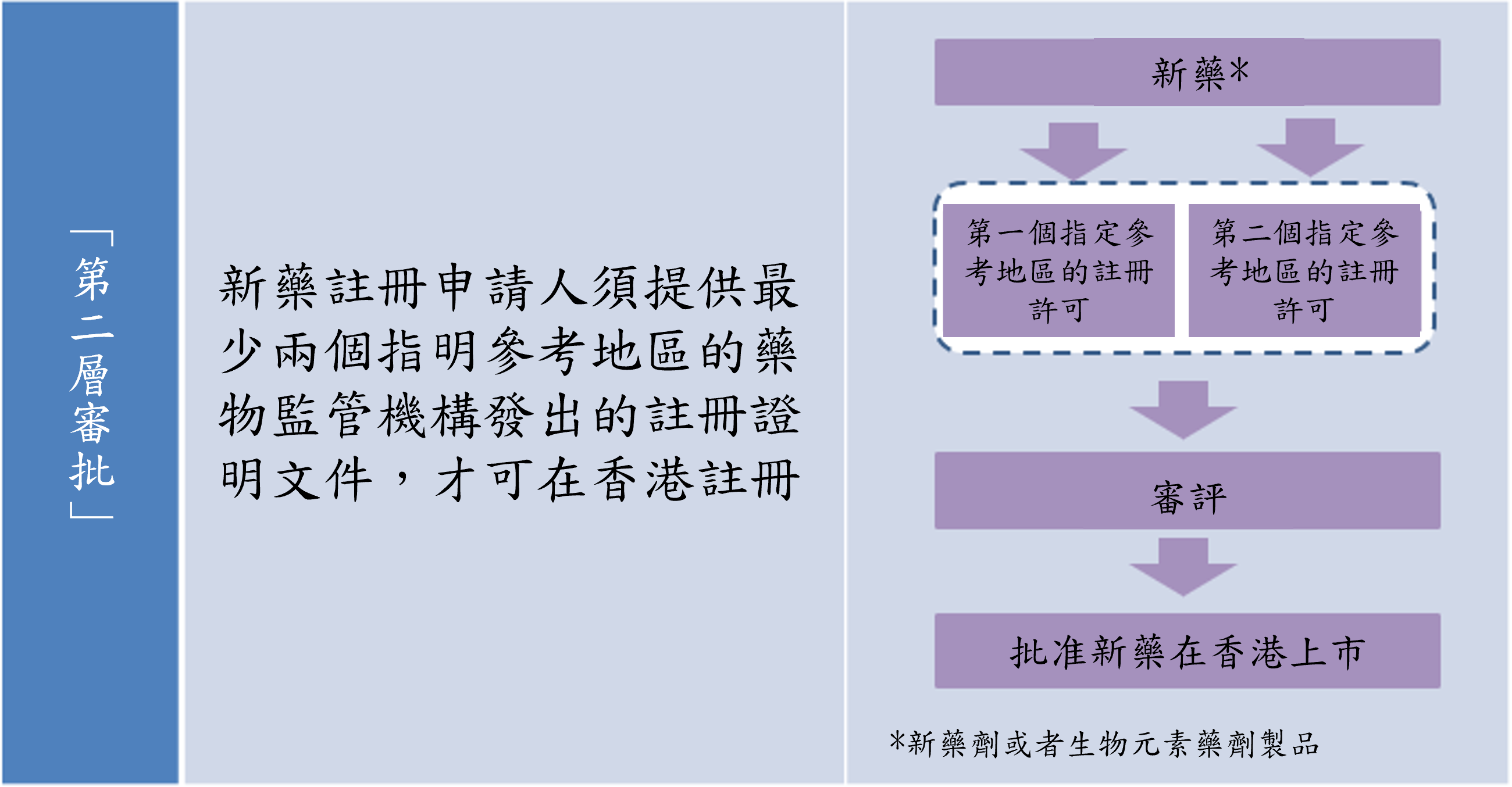 香港一直實行的是俗稱「第二層審批」的新藥註冊審批機制,這是一種依賴指明參考國家/地區的藥物監管機構審批結果的機制,現時香港共有36個參考地區,包括澳洲、巴西、加拿大、中國內地、歐盟26個國家、日本、韓國、新加坡、瑞士、英國及美國,「第二層審批」的核心原則是參考有關註冊許可作為香港註冊新藥的主要考慮,以減省重複的審評及資源上的負擔,這模式是世界衞生組織對資源不足的藥物監管機構的建議。在一般情況下,新藥須先獲得至少兩個指明參考地區藥物監管當局的註冊許可,隨後再由香港藥劑業及毒藥管理局進行審評,在確保藥物符合安全、效能和素質的要求下,才可在香港註冊。由於註冊申請人需要等待香港以外地區的註冊許可,整個流程通常較為耗時,從臨床結果公布至在香港獲批上市,可能需要約兩年的時間,這某程度上限制了新藥快速引入香港,雖然在處理公共衞生緊急事態的新藥註冊申請上,本港跟其他地區一樣,有特別機制處理一些個別特殊情況。