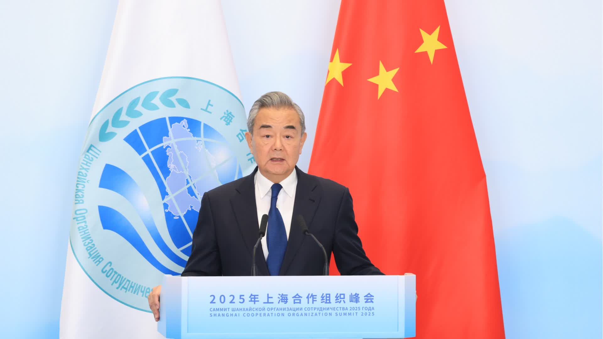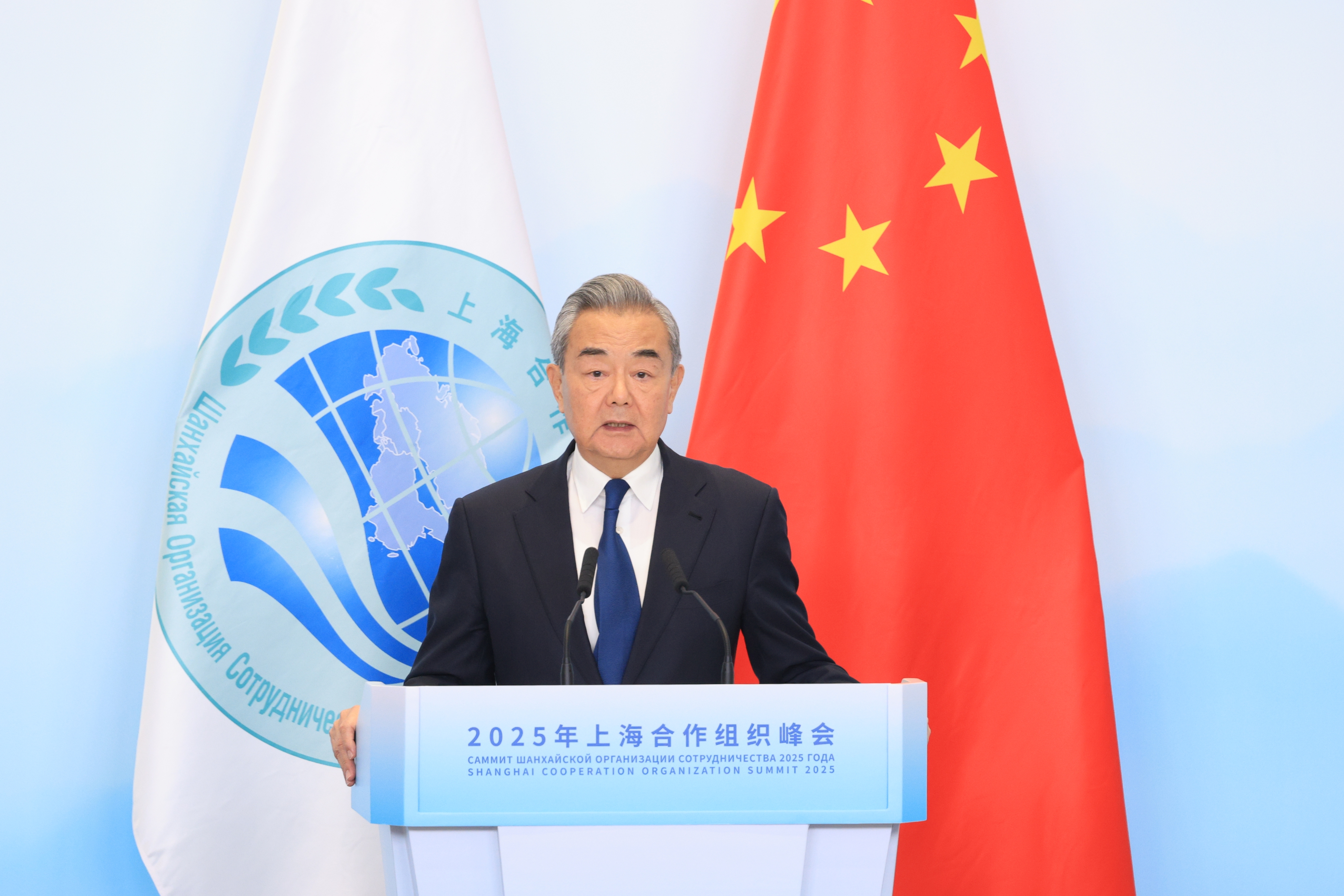 9月1日,上合組織天津峰會結束之際,中共中央政治局委員、外交部長王毅在峰會新聞中心同上合組織秘書長葉爾梅克巴耶夫共同會見中外記者並答問。王毅介紹本屆峰會取得的八大成果。