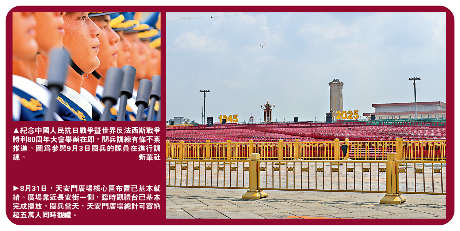 大公報報道,特區政府表示,感謝中央人民政府邀請,行政長官李家超將率領由香港各界人士組成的代表團到北京,參加9月3日(明日)舉行的中國人民抗日戰爭暨世界反法西斯戰爭勝利80周年紀念活動,包括上午的紀念大會和閱兵,以及文藝晚會。李家超亦會出席大會在中午舉行的招待會。