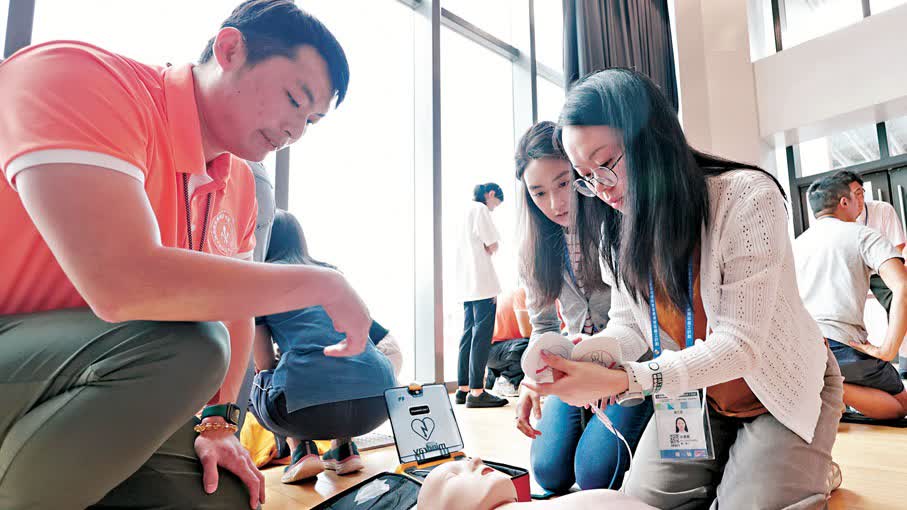 在心肺復甦及AED使用實操環節,義工領袖分組進行練習,並由導師教授他們如何為患者貼上電擊貼片及進行心肺復甦。導師強調,義工領袖在遭遇醫療事故時需保持冷靜,第一時間聯繫緊急服務,並檢查患者呼吸及氣道是否暢通;若患者陷於昏迷,義工應輕輕後仰患者頭部,確保其氣道無阻塞,並檢查患者對聲音或觸碰的反應。心肺復甦須由受過專業訓練者按壓患者胸骨下半部,頻率為每分鐘100次至120次,深度不少於5厘米。