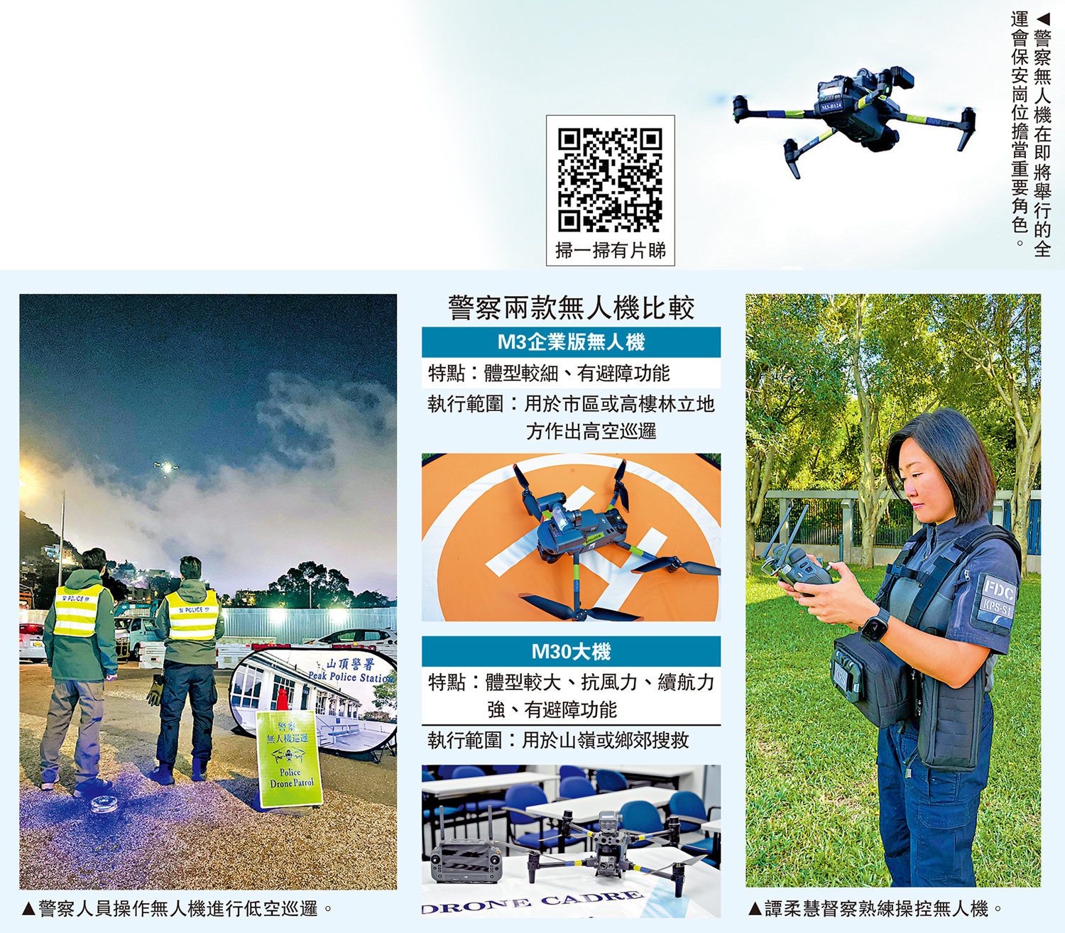 (大公報記者 李宇俊〈文〉許棹傑〈圖/視頻〉)第十五屆全國運動會將於11月9日至11月21日舉行,香港首次連同廣東和澳門,攜手承辦全運會及全國殘疾人運動會暨特殊奧林匹克運動會部分賽事。作為國家級體育界盛事,保安工作不容忽視。香港警方接受《大公報》訪問,介紹了警察無人機隊在全運會保安中發揮的作用,包括借鑒多國經驗優化裝備配置,無人機在賽事前期的準備、賽事期間巡邏及散場管理等環節起了關鍵作用,同時亦透露了警察小型無人機推廣計劃的三階段部署。
