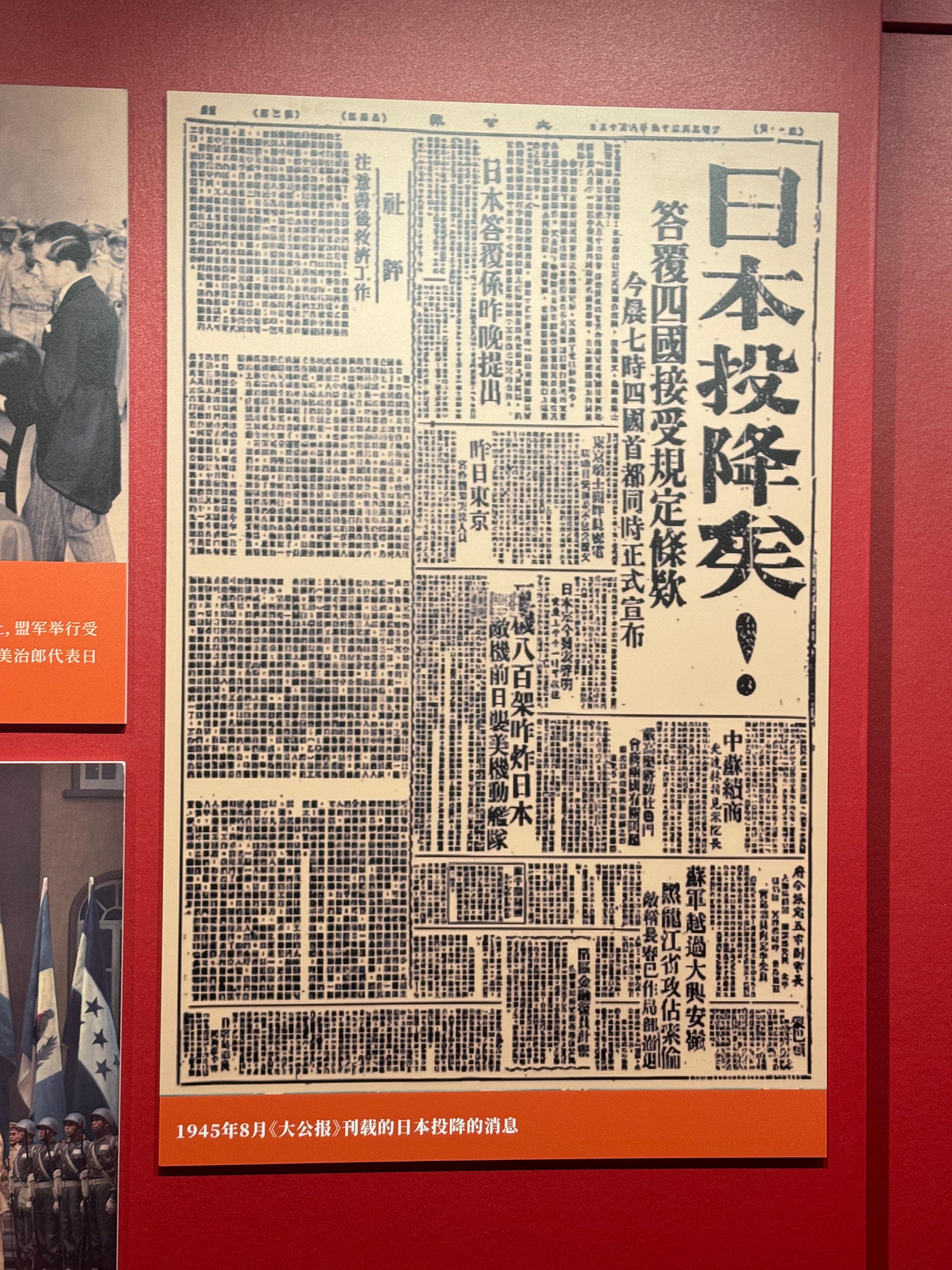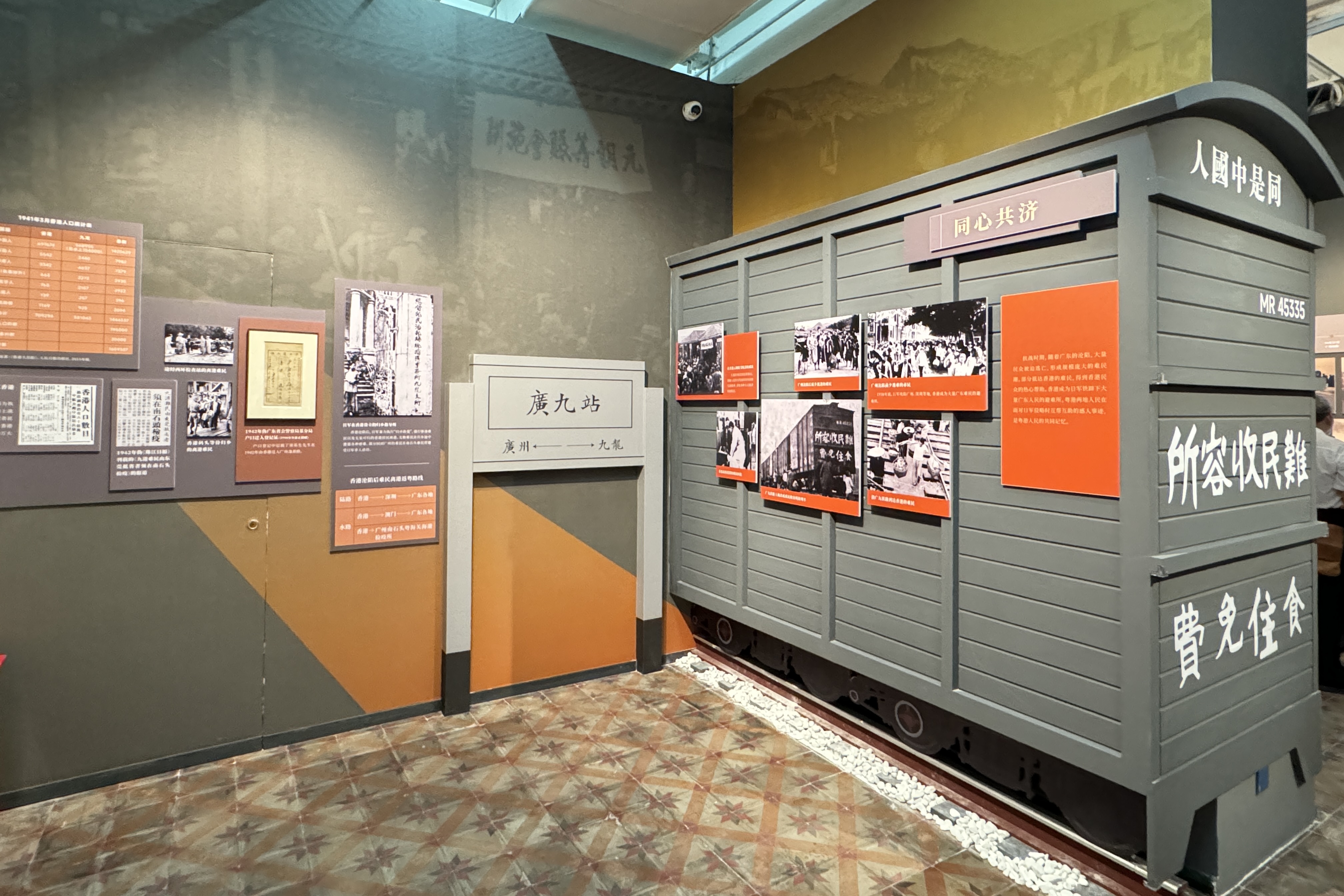 「灣區烽火」展覽分為「淪陷」「抗爭」「勝利」三個部分,通過豐富的實物、歷史照片、數據等介紹了廣州、香港先後淪陷,兩地人民流離失所,遭受深重災難;後在中國共產黨的領導下,粵港通過武裝抗戰和「文化抗戰」進行不屈鬥爭的歷史。展覽最後一部分回顧了日本投降、中國人民取得勝利的歷史時刻,在結語前以《大公報》著名的「日本投降矣」版面做收尾,生動呈現粵港兩地共同抗擊侵略的光榮歷史和感人事跡。