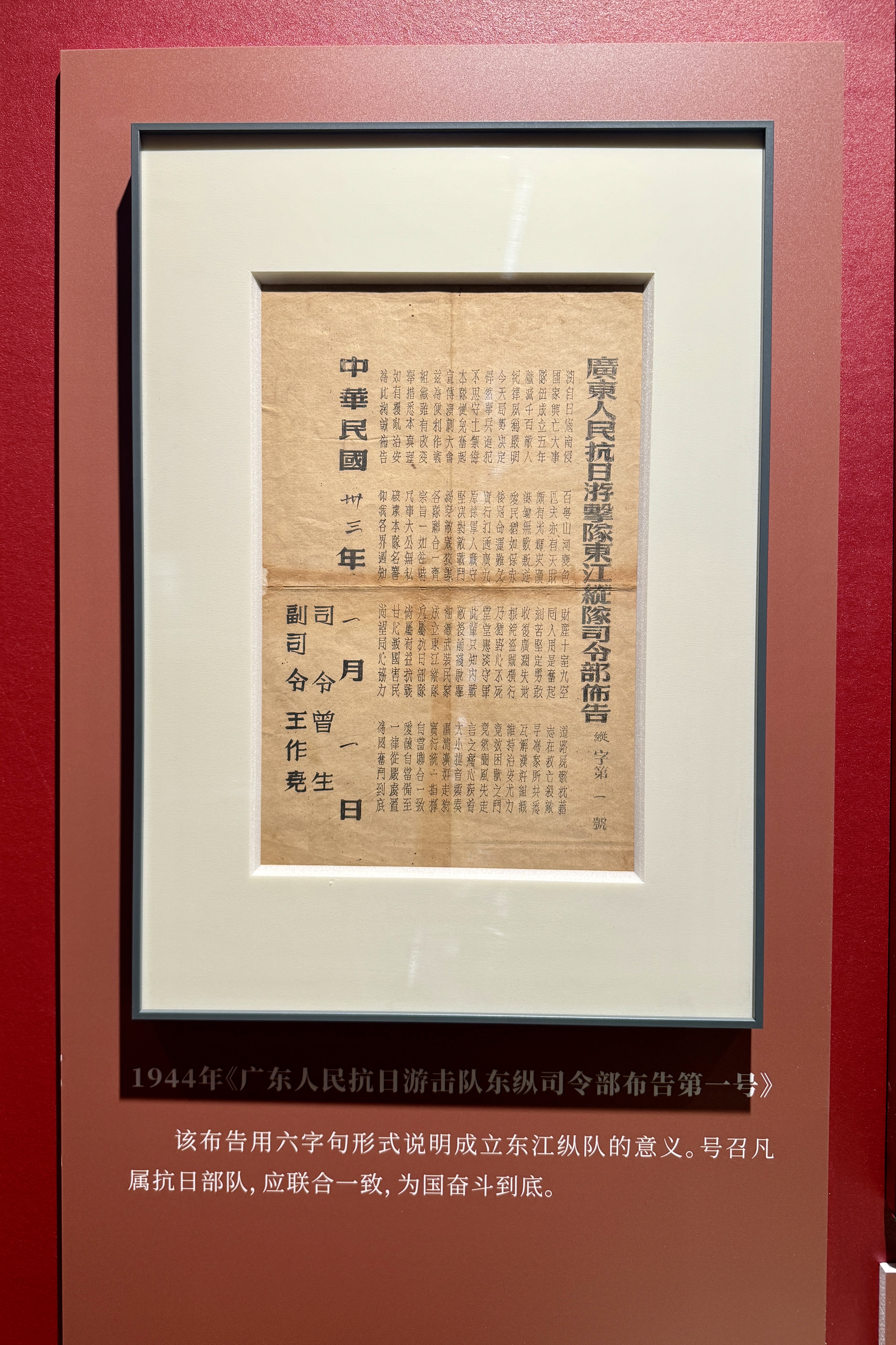(大公文匯網記者 李紫妍 廣州報道)由廣東革命歷史博物館主辦的「灣區烽火 不朽豐碑——粵港抗戰歷史展」2日在廣州起義紀念館開展,全景展示粵港抗戰歷史畫卷。展覽共展出實物展品209件/套,歷史照片、圖表291張,重點展品包括葉希夷(葉挺)將軍前往越南籌募抗日軍費辦理的護照、《廣東人民抗日游擊隊東江縱隊成立宣言》、廣東人民抗日游擊隊東江縱隊司令部布告第一號、1944年1月中山人民抗日義勇大隊獎勵給有功人員的模範銀戒指等,《大公報》「日本投降矣」版面出現在結語前,為展覽結尾。該展覽與正在香港熱展的「風雨同舟 共建和平」粵港人民抗戰勝利80周年展形成呼應。廣東革命歷史博物館館長易西兵表示,兩個展覽共同基於粵港兩地同仇敵愾、戮力同心抗擊侵略的歷史,呈現了兩地人民風雨同舟、血脈相連的深厚情誼。