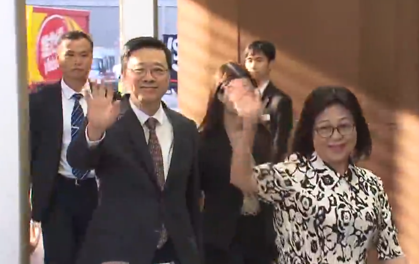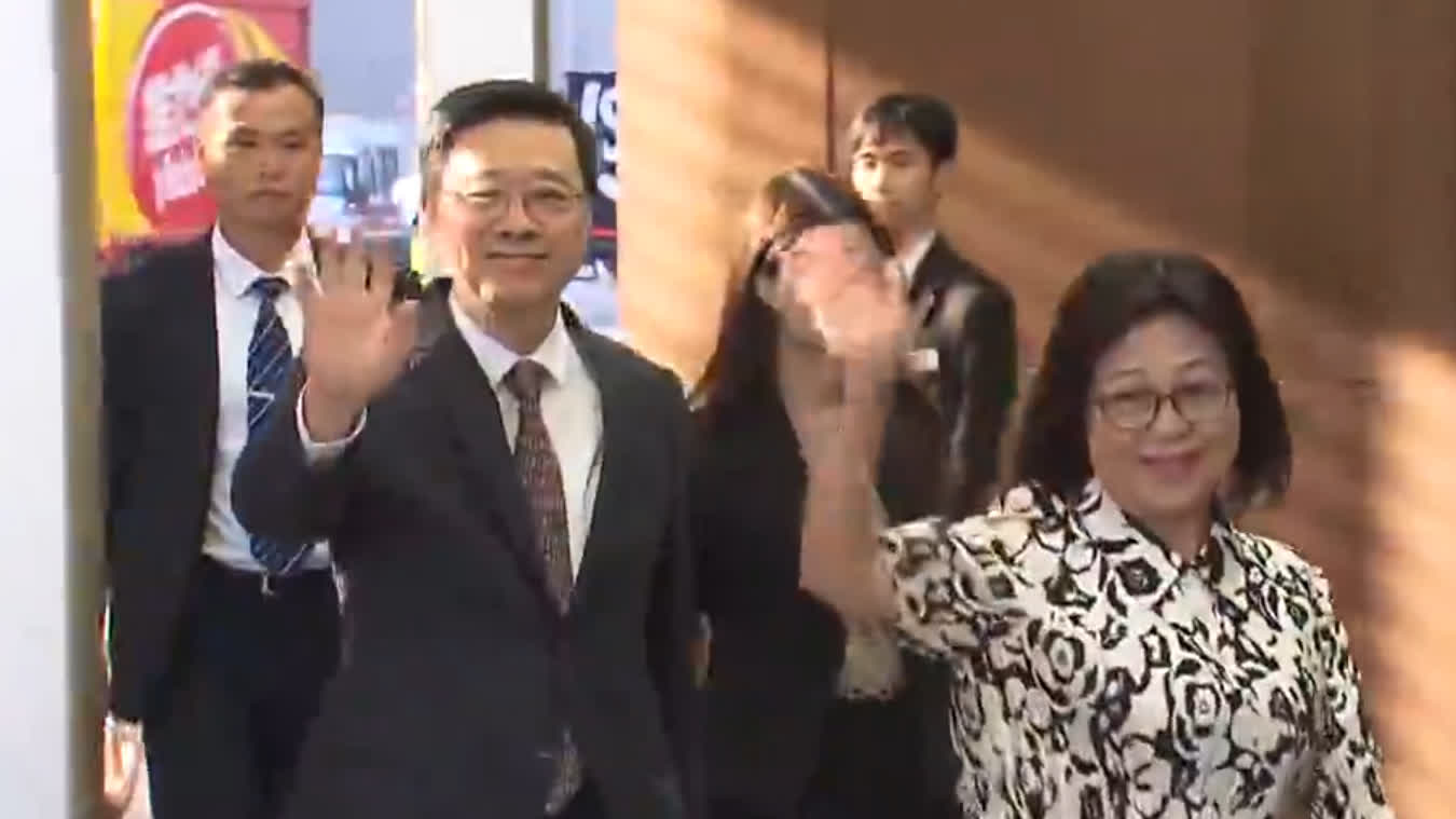 李家超與太太林麗嬋早上約8時抵達機場,全國政協副主席梁振英、財政司司長陳茂波、律政司司長林定國、政務司副司長卓永興、民政及青年事務局局長麥美娟、文化體育及旅遊局局長羅淑佩等亦陸續到機場。