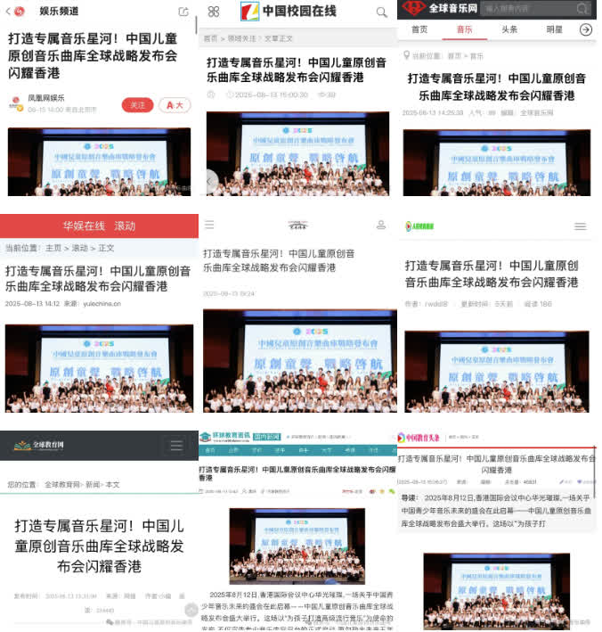 鳳凰網娛樂、全球音樂網、中國教育頭條、中國校園在線等多家媒體進行報道,傳遞發布會盛況,讓「為兒童打造高級流行音樂」 的理念觸達更廣泛受眾,進一步擴大了中國兒童原創音樂戰略的社會影響力,引發各界對青少年音樂教育與原創內容發展的熱烈討論。