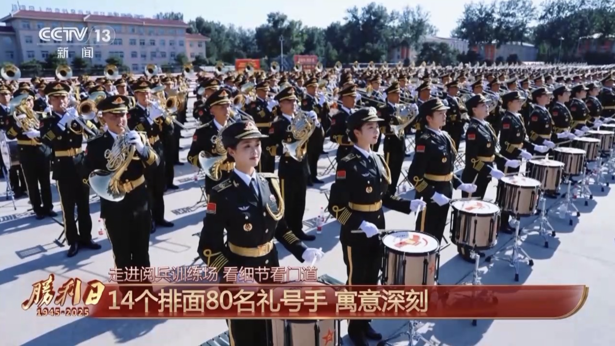 本次聯合軍樂團在演奏隊形的編排上,整體設置了14個排面,寓意14年抗戰;前排設置了80名禮號手,寓意抗戰勝利80周年。樂曲演奏分為暖場、儀式、閱兵式、分列式、尾聲5部分;將使用禮號、圓號、單簧管,軍鼓、薩克斯(Saxophone)等15種樂器。