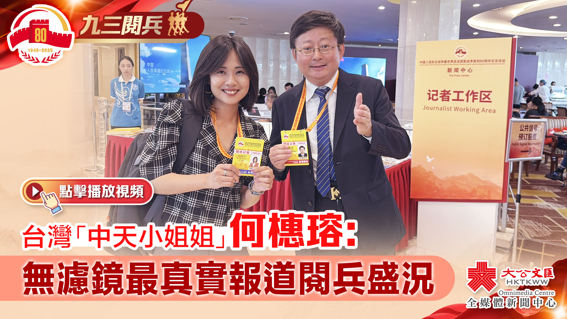 (大公文匯網 記者 凱雷、羅洪嘯、實習記者黃佳賢 北京報道)在九三閱兵即將拉開帷幕之時,記者於新聞中心偶遇了來自台灣中天電視台的記者何橞瑢。何橞瑢憑藉其真實質朴、克制理性且毫無濾鏡修飾的報道風格,在網絡上迅速走紅,被內地網友親昵地喚作「中天小姐姐」。被問到閱兵最期待什麼環節時,何橞瑢告訴記者:「不能隨意眨眼,要全程目不轉睛的觀看。中天人必須有中天的風格,就是無濾鏡最真實,整體去做還原。我也做了功課,看過前幾屆閱兵的影像,閱兵行程其實是蠻緊湊的,那必須是目不轉睛的。」