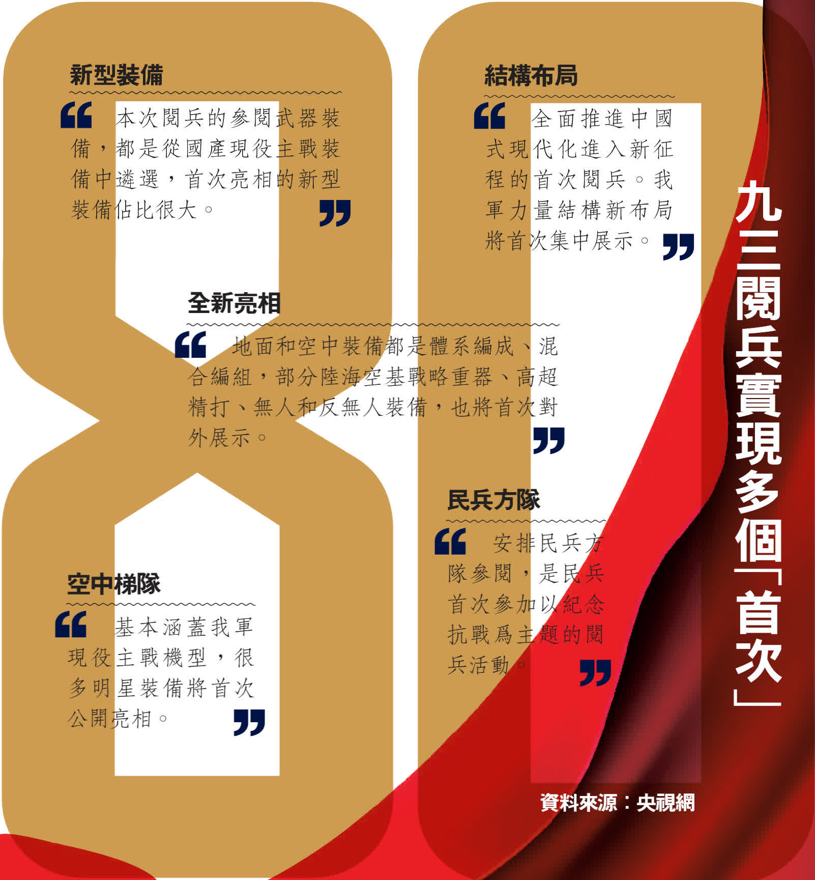 根據閱兵領導小組辦公室發布的消息,九三閱兵活動將實現多個「首次」,既是全面推進中國式現代化進入新征程的首次閱兵,也是人民軍隊奮進建軍百年的嶄新亮相。