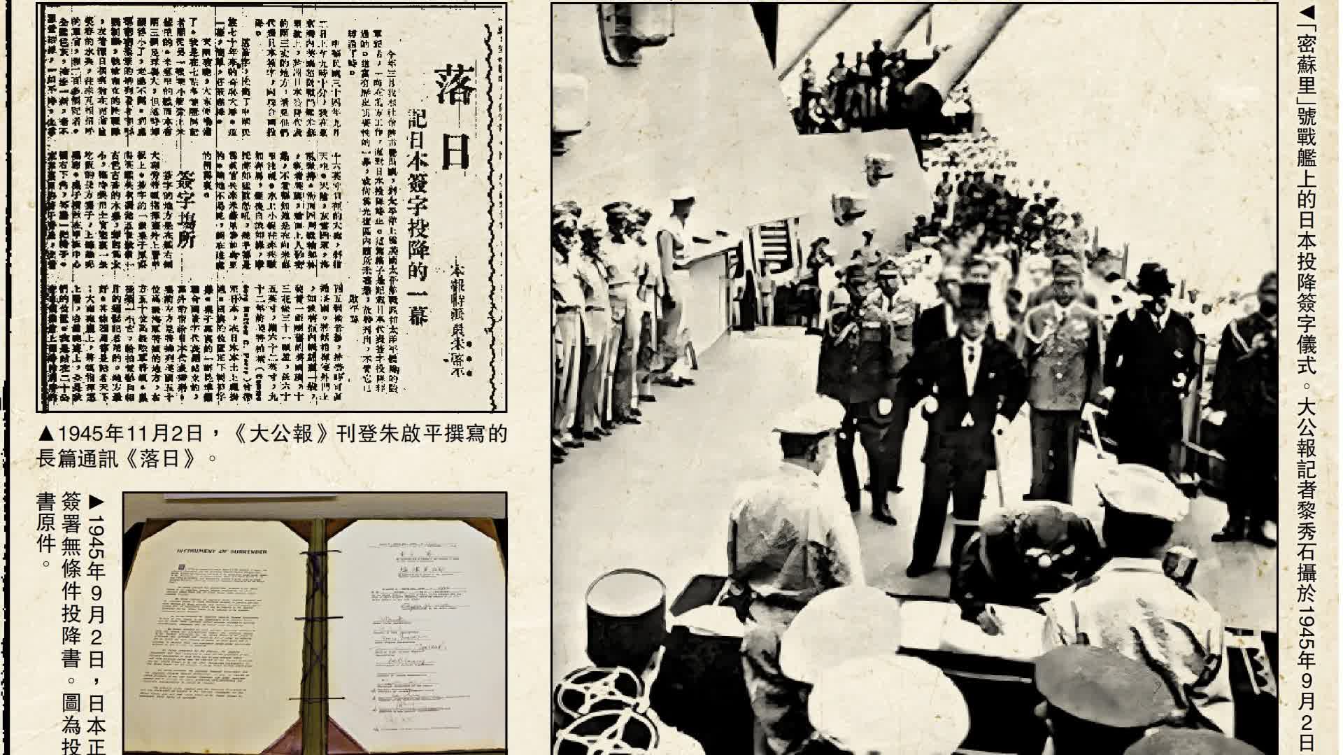 1945年9月2日,美軍「密蘇里號」戰列艦停泊在日本東京灣,甲板上,在中國等9個受降國代表注視下,日本代表在投降書上簽字。儀式上,三位中國記者中有兩位來自《大公報》──朱啟平和黎秀石。他們距簽字桌不過三五丈遠,親身見證了昔日在中國趾高氣揚的日本侵略者俯首稱降的重要時刻,稿件在《大公報》刊發後,產生強烈反響。