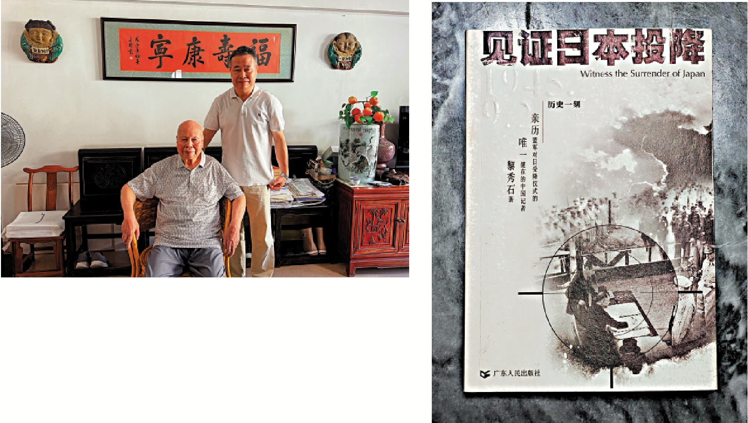 「那天上午,我五伯父的位置正對太陽,他很擔心拍不到照片。下一瞬間,一片烏雲飄來,替他擋了光,他趕緊按下快門。就這兩張,留下了中國代表在『密蘇里』號上簽字受降的瞬間。」黎秀煊翻開書籍,其子黎其森在他的指引下將當年的現場細節娓娓道來。說到這裏,兩人又忽然停住,像聽見了1945年9月2日九點十八分的鐘聲。
