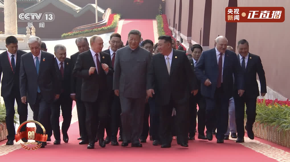 據央視新聞消息,9月3日上午,紀念中國人民抗日戰爭暨世界反法西斯戰爭勝利80周年大會在北京天安門廣場隆重舉行。習近平同出席大會的外方代表團團長一起拾級而上,登上天安門城樓。
