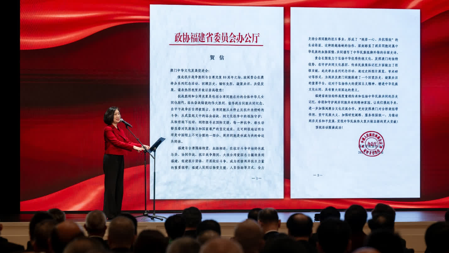 澳門中華文化發展促進會理事長、橫琴海峽兩岸青年文化交流中心負責人陳志玲女士在會上宣讀了台灣前立法機構負責人王金平、台北市長蔣萬安、中廣董事長趙少康、桃園市長張善政、福建省政協為紀念活動發來的賀信,賀信中強調抗戰精神(愛國、團結、自強)是中華民族的寶貴財富,應在新時代繼續發揚,推動國家完全統一與民族復興。