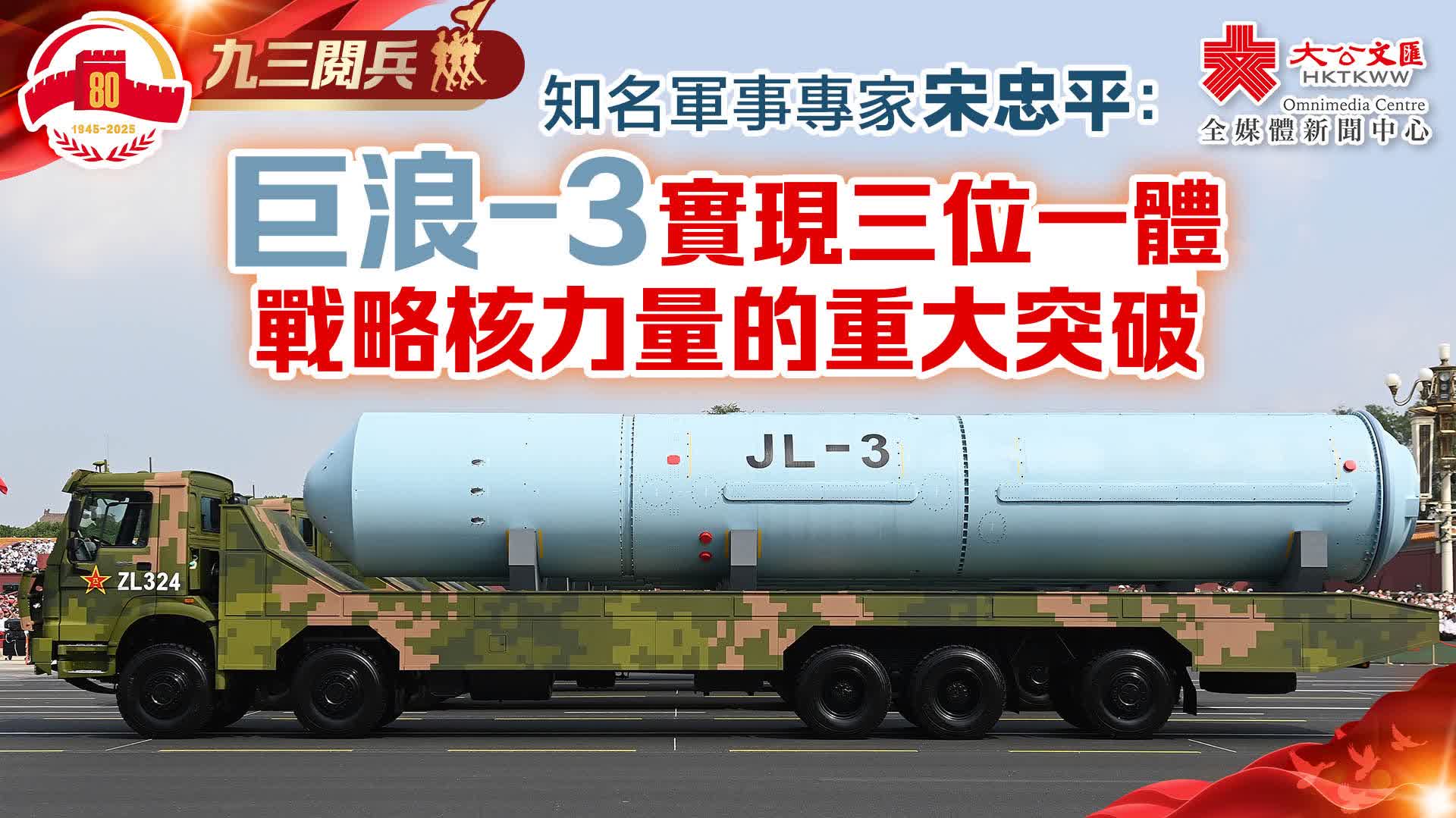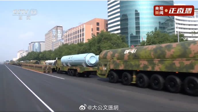 (大公文匯網记者葛沖報道)國之重器,壓艙基石。核導彈第一方隊3日震撼登場,接受祖國和人民檢閱。受閱的「驚雷-1」空基遠程導彈、「巨浪-3」潛射洲際導彈、「東風-61」陸基洲際導彈、「東風-31」新型陸基洲際導彈,首次集中展示我軍陸、海、空基「三位一體」戰略核力量,是維護國家主權、捍衛民族尊嚴的戰略「王牌」。