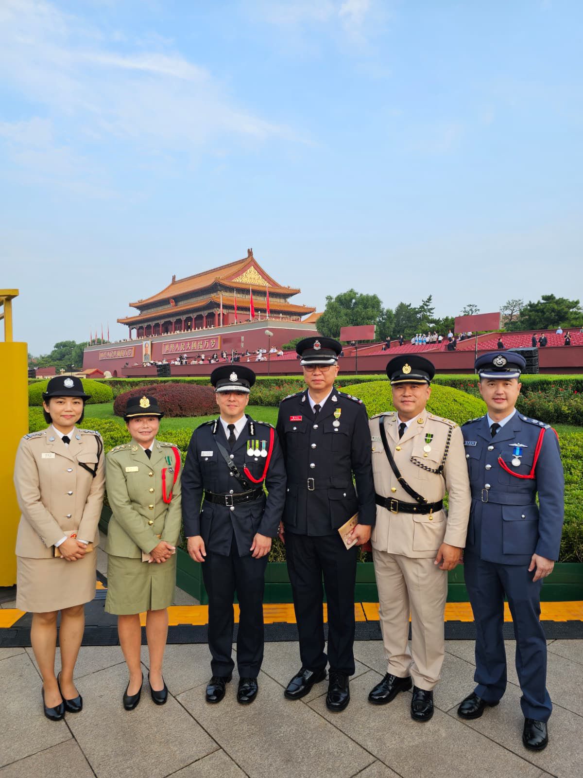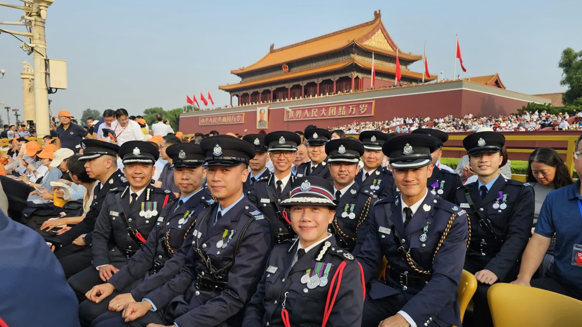 大公文匯全媒體報道,9月3日上午,紀念中國人民抗日戰爭暨世界反法西斯戰爭勝利80周年大會在北京天安門廣場隆重舉行,以盛大閱兵儀式,同世界人民一道紀念這個偉大的日子。香港警務處處長周一鳴率領警隊代表團,一行15人隨特區代表團觀禮,現場感受國家強大實力。