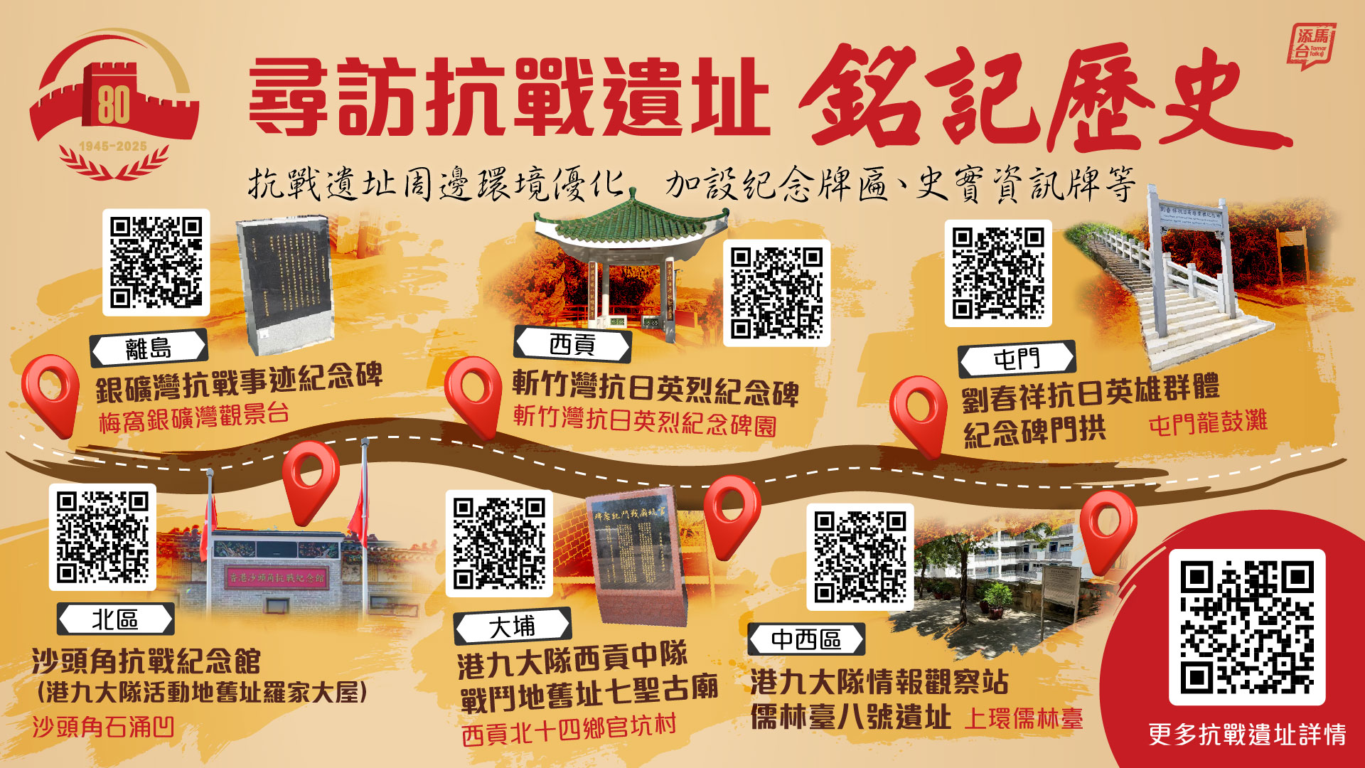 為紀念中國人民抗日戰爭暨世界反法西斯戰爭勝利80周年,多區抗戰遺址周邊環境已作優化,並加設紀念牌匾、史實資訊牌等,讓市民更全面認識抗戰歷史及抗戰勝利的重大意義。