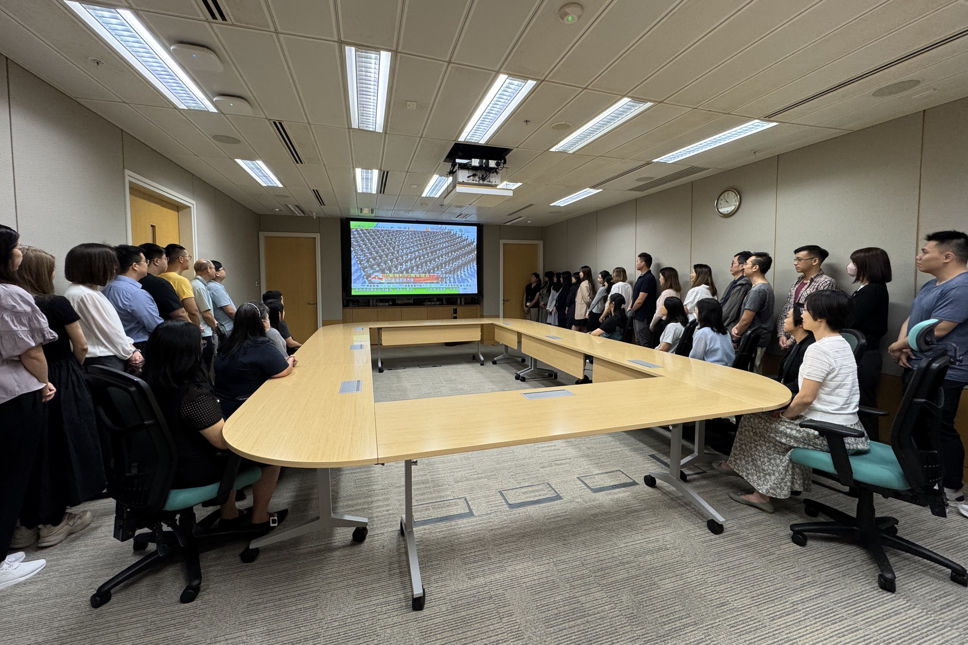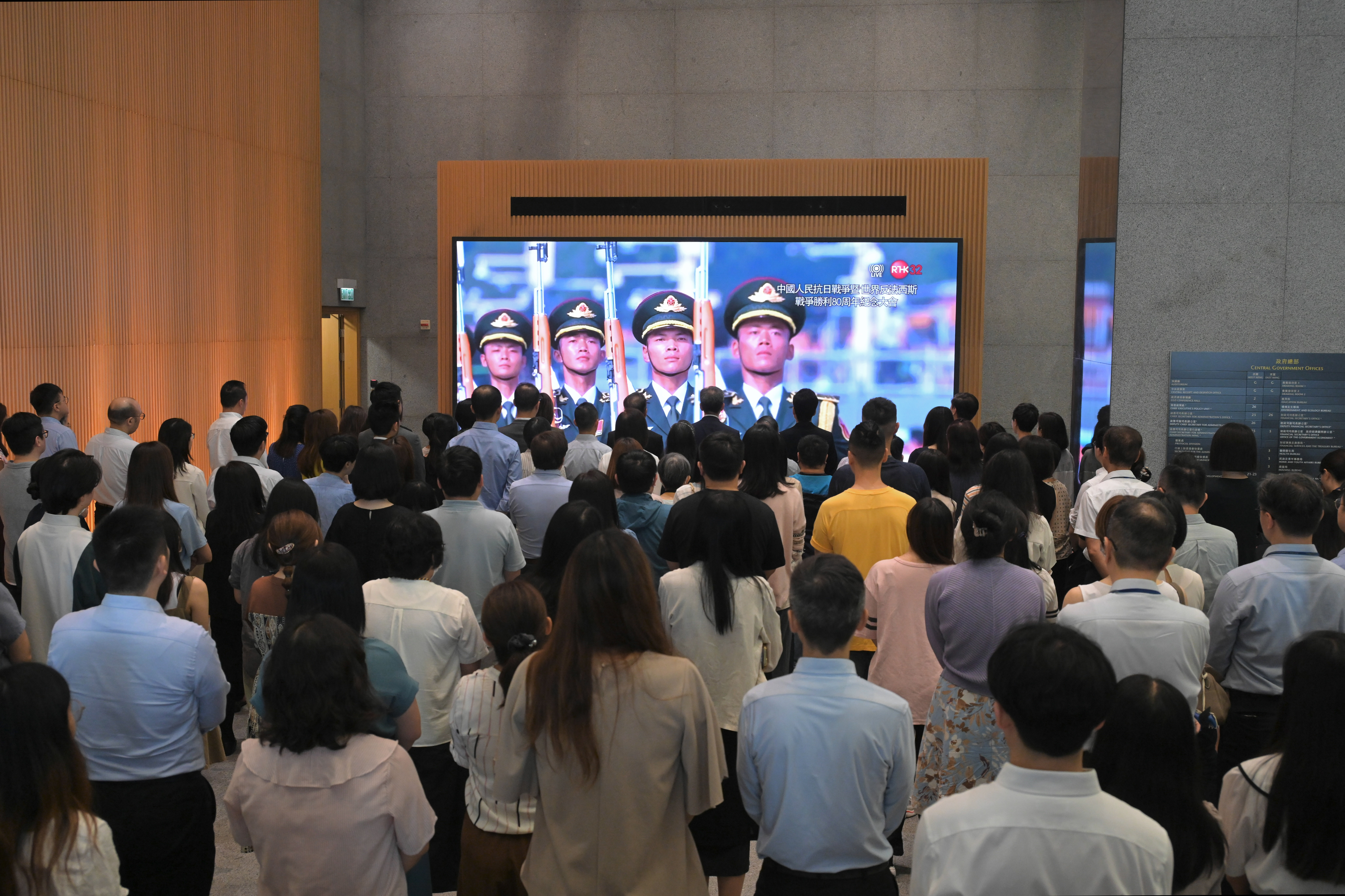 梁卓文其後和政府高層官員及一眾公務員同事,一同在政府總部西翼大堂透過直播,觀看在北京舉行的抗戰勝利80周年閱兵儀式,為向在這場全民族的抗爭中奮勇抗敵、盡忠報國的先賢先烈致敬。局內和公務員學院的同事亦分別在辦公室的會議室或課室觀看直播。