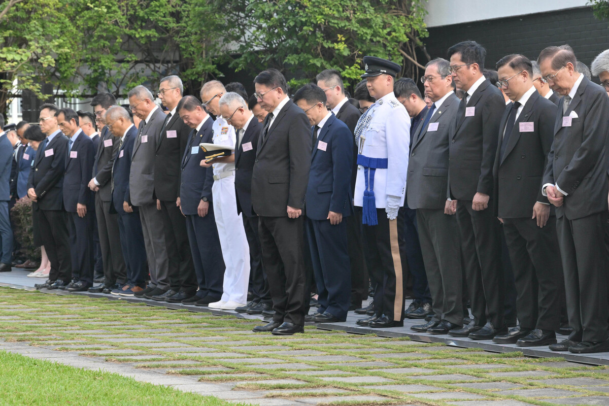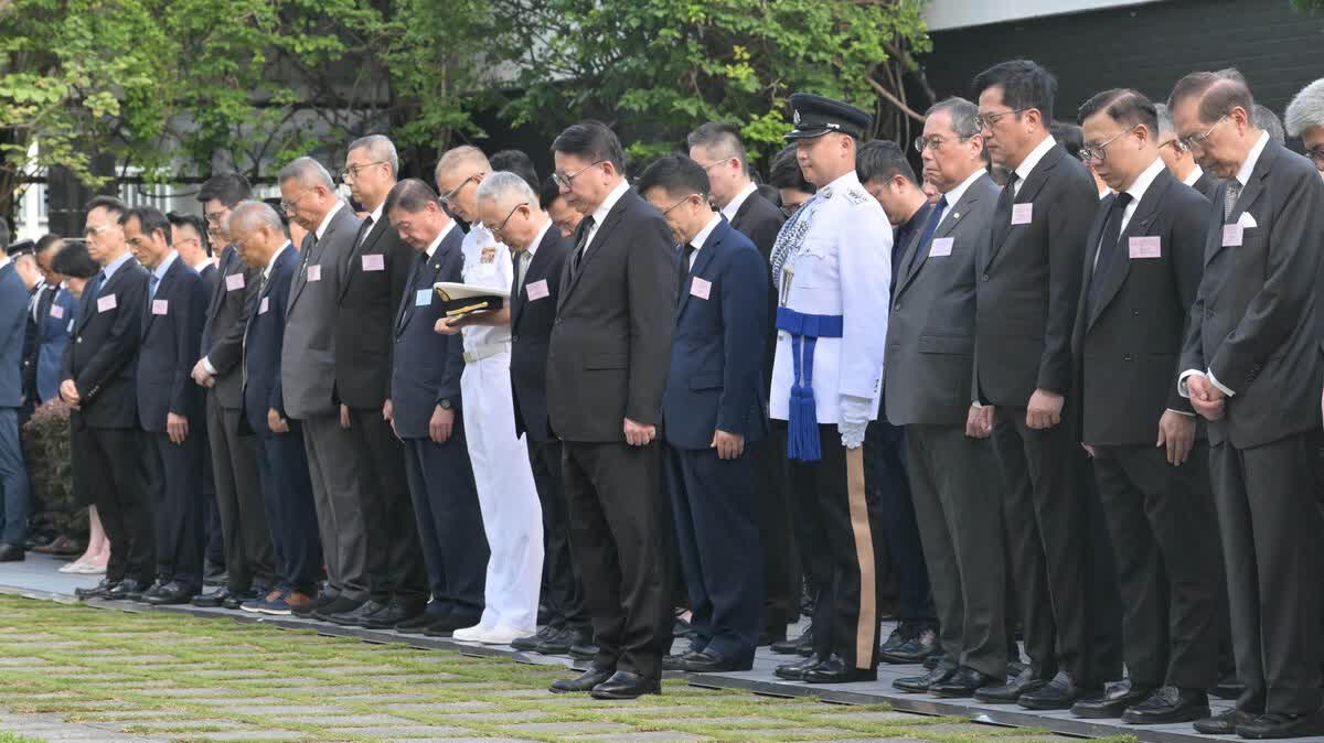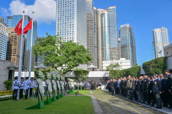 署理行政長官陳國基和特區政府高層官員今日早上在香港大會堂紀念花園出席特區政府舉行的官方儀式,紀念中國人民抗日戰爭暨世界反法西斯戰爭勝利80周年,銘記中國人民抵抗日本侵略,緬懷先烈和死難同胞。