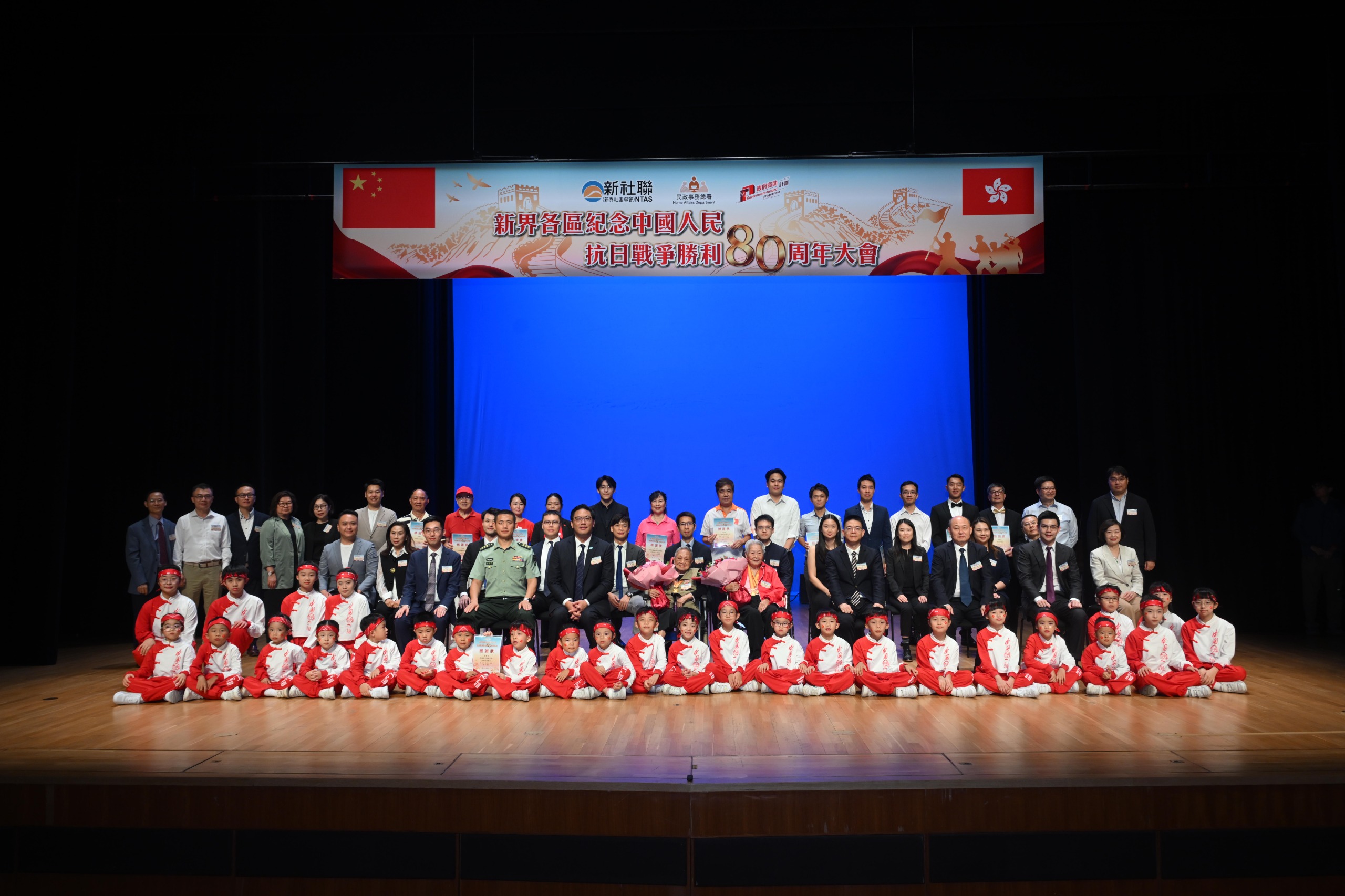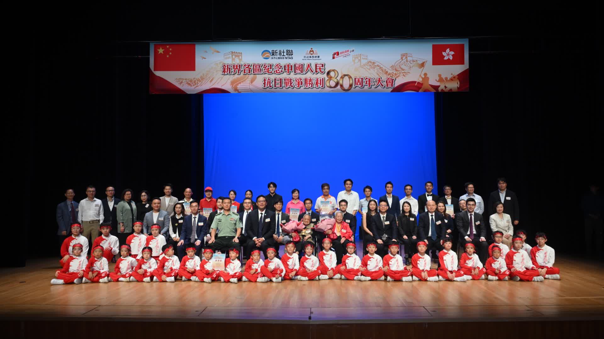 大公文匯全媒體報道,9月3日是中國人民抗日戰爭暨世界反法西斯戰爭勝利80周年紀念日。由新界社團聯會、民政事務總署合辦的「新界各區紀念中國人民抗日戰爭勝利80周年大會」於荃灣大會堂演奏廳舉行。署理民政及青年事務局局長梁宏正、中央政府駐港聯絡辦新界工作部部長羅建君、廣東省退役軍人事務廳副廳長董仲琪、中國人民解放軍駐香港部隊合成旅副政治委員李志平等蒞臨主禮。大會亦有幸邀請到抗日老戰士陳來嬌、劉蘇,烈士家屬趙麥紀賢出席,與新界社團聯會理事長譚鎮國及現場近千名社會各界人士共同紀念抗戰勝利80周年。