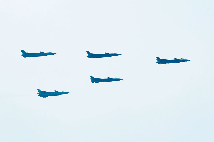 殲擊機梯隊集合了中國多款新型隱形戰鬥機,作為中國自主研製的新型隱形戰鬥機,殲-35A可以執行制空作戰任務及對地、對海多種突擊任務,是隱形與反隱形作戰體系的規模組成力量。