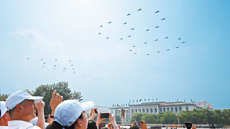 (香港文匯報 記者 劉凝哲 北京報道)戰鷹呼嘯,氣勢如虹!閱兵式上,空中梯隊的軍機編隊米秒不差馭風飛越天安門接受檢閱。其中,殲擊機梯隊集合了中國多款新型隱形戰鬥機,由殲-16D、殲-20、殲-35A、殲-20S、殲-20A組成的兩個楔隊震撼亮相,殲擊機家族加速換羽更新,堅決擔負起捍衛祖國領空不容侵犯的神聖使命。