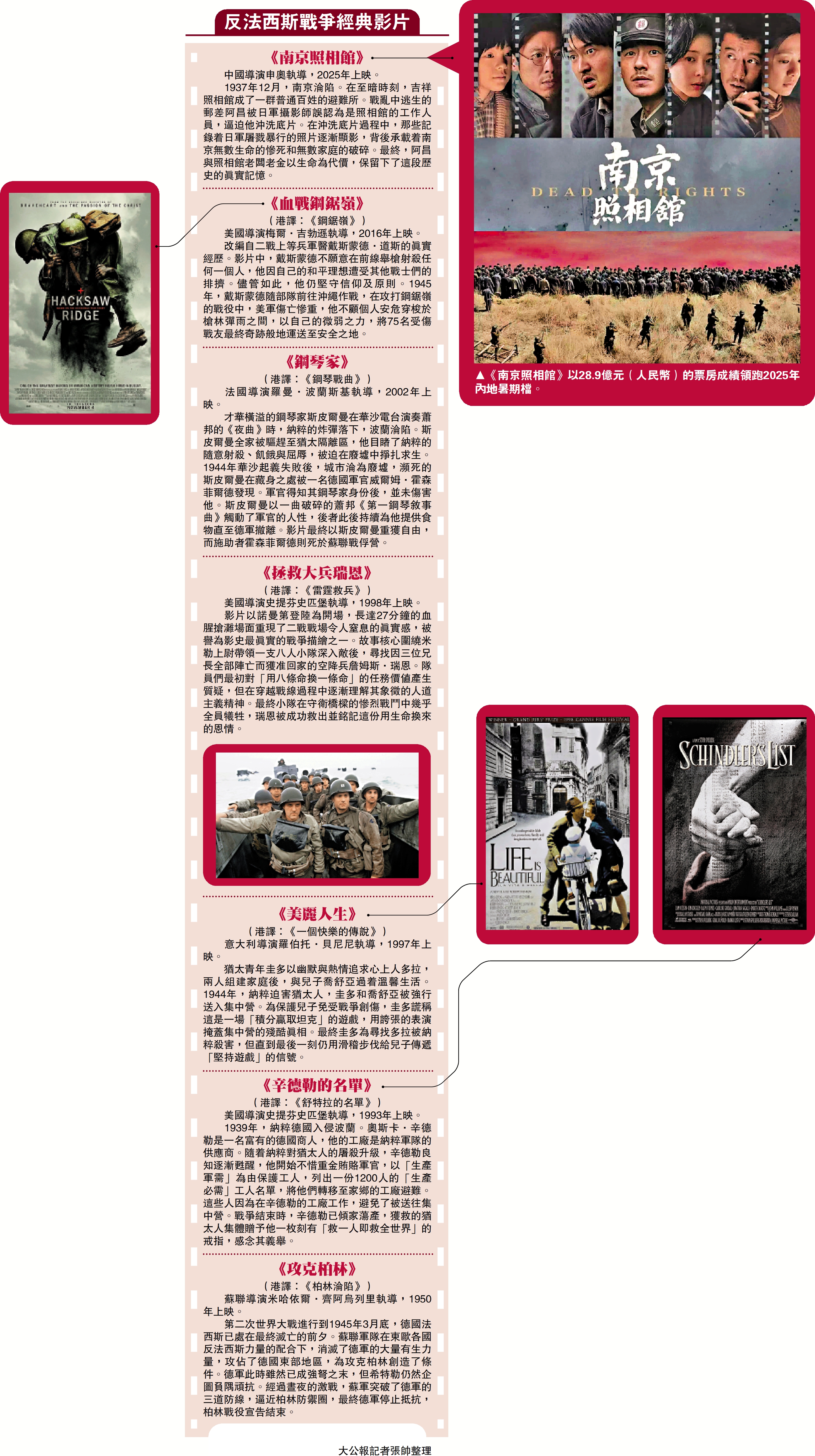 韓萬峰對《大公報》表示,源自真實事件的電影更能震撼心靈,讓人久久難忘。另一部經典影片《鋼琴家》,也是根據波蘭猶太作曲家和鋼琴家瓦拉迪斯羅·斯皮曼的自傳改編。在影片效果上,這類極致寫實的電影用鏡頭真實地還原了戰爭給人類帶來的殘酷傷害,讓觀眾在觀影中加深對反法西斯戰爭歷史的了解。