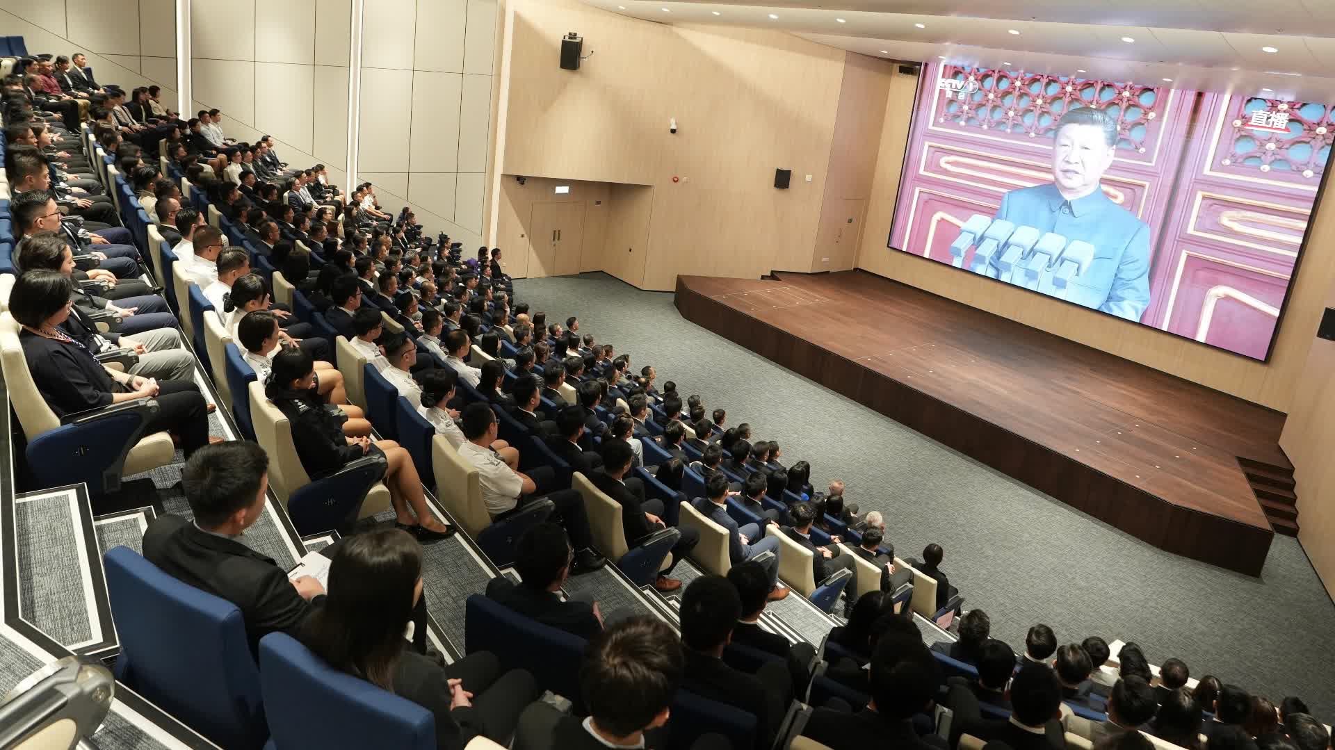 處長級長官亦帶領同事及受訓學員分別在將軍澳入境處總部演講廳和屯門入境事務學院觀看紀念大會直播,共同見證國家偉大成就,與全國人民一起銘記歷史、緬懷先烈。正密鑼緊鼓準備結業會操的入境處儀仗隊,亦把握機會學習天安門廣場人民戰士的凜凜英姿。