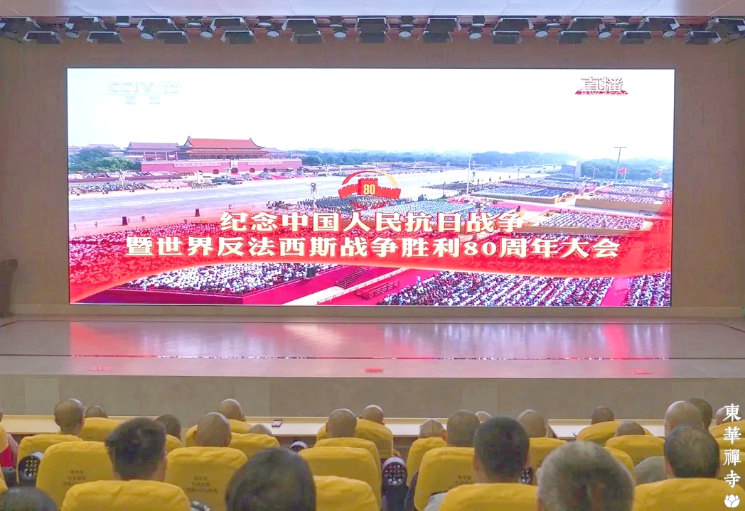 9月3日上午,東華禪寺組織全體常住在文博館禮堂觀看「紀念中國人民抗日戰爭暨世界反法西斯戰爭勝利80周年」閱兵儀式實況直播。