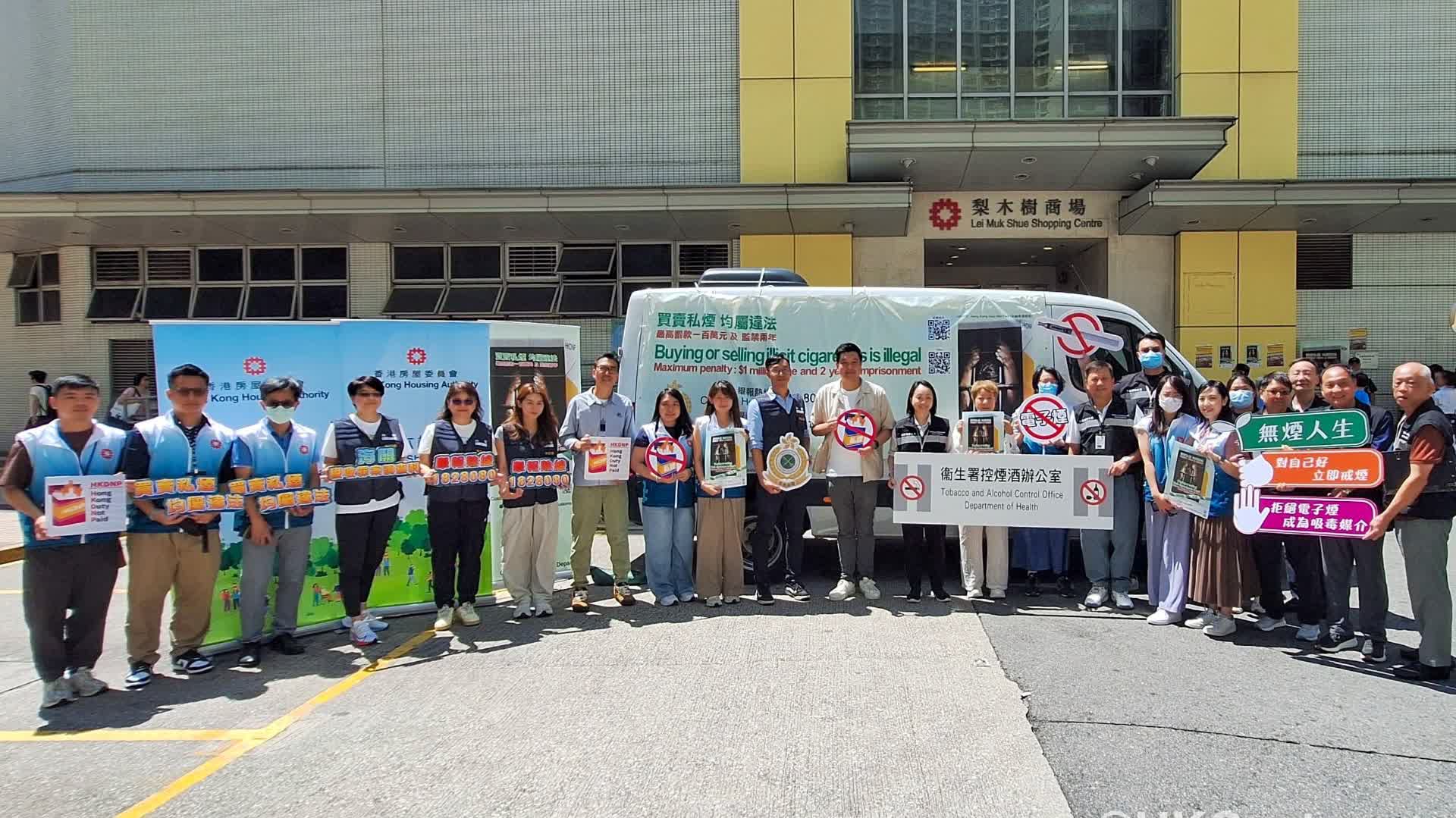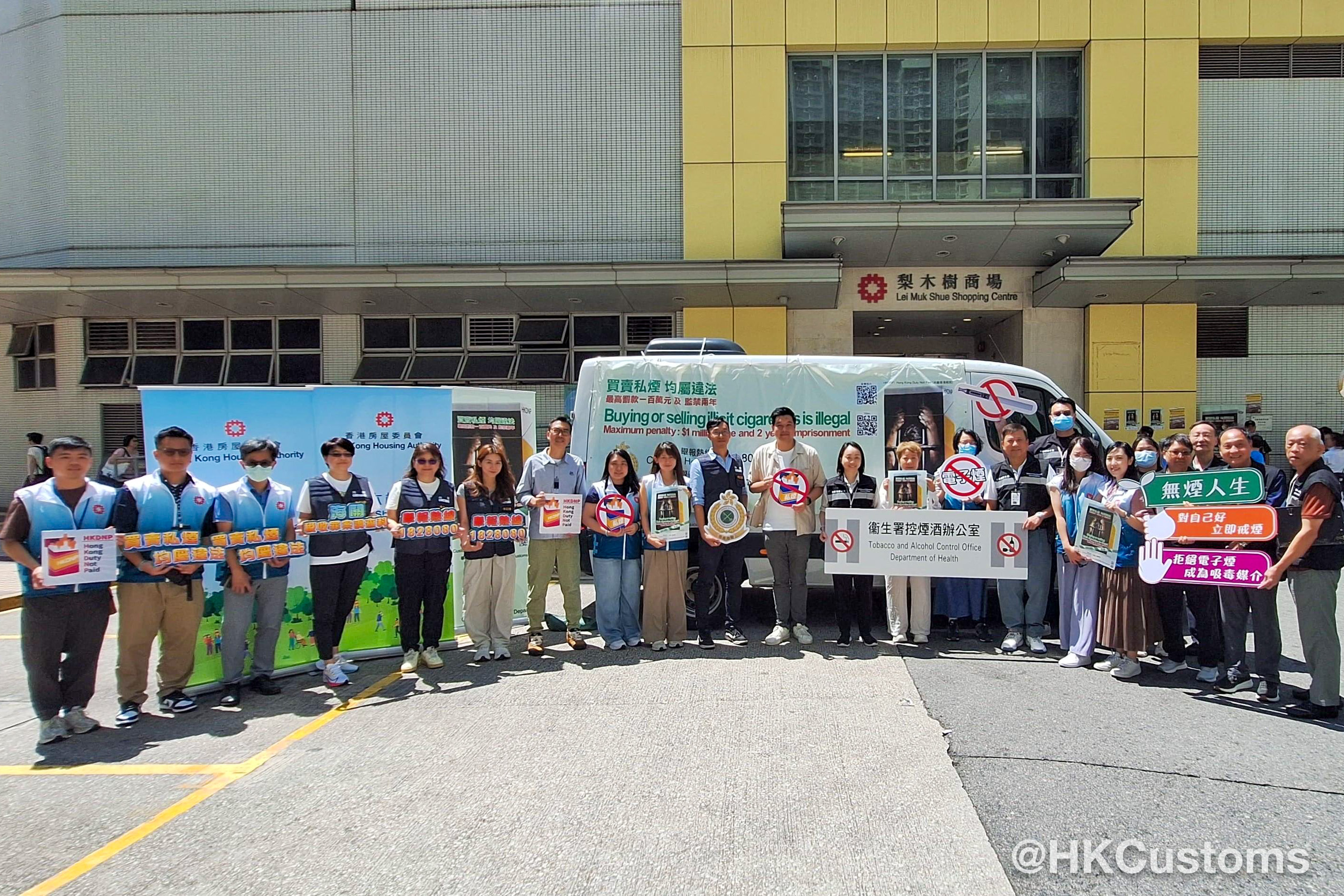 香港海關於八月二十七日與荃灣區區議員、衞生署控煙酒辦公室、房屋署及社區關愛隊在荃灣梨木樹邨進行聯合反私煙宣傳活動。