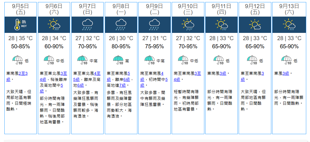 根據天文台最新九天天氣預報,本港天氣自周日(9月7日)起轉差,稍後驟雨較多;下周一(9月8日)多雲,有狂風驟雨及幾陣雷暴,部分地區雨勢較大。隨着高空反氣旋再度增強,下周中後期該區驟雨逐漸減少,天色好轉,下周四(9月11日)部分時間有陽光,最高氣溫達33度。