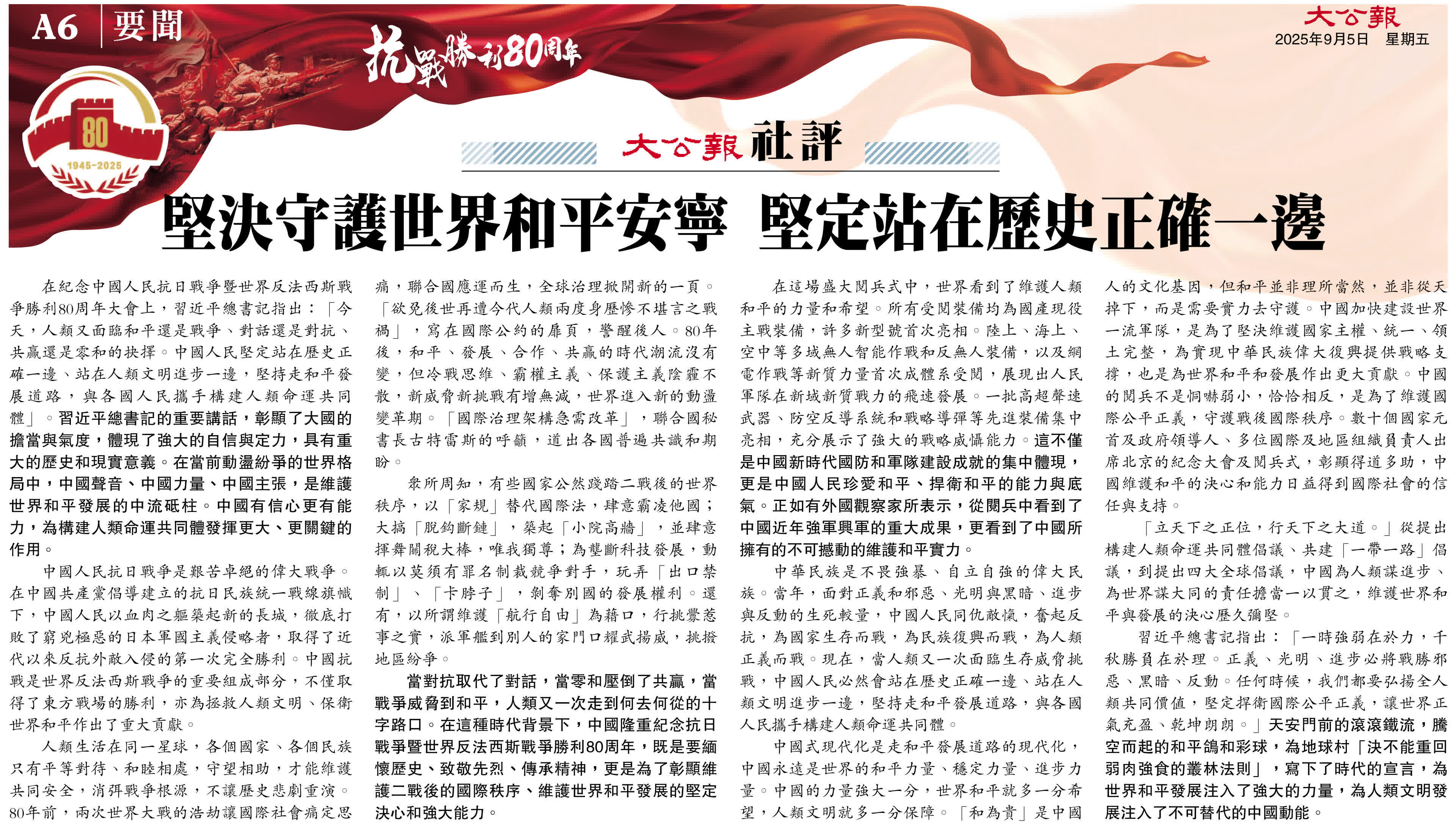 (來源:大公報A6:要聞 2025/09/05)