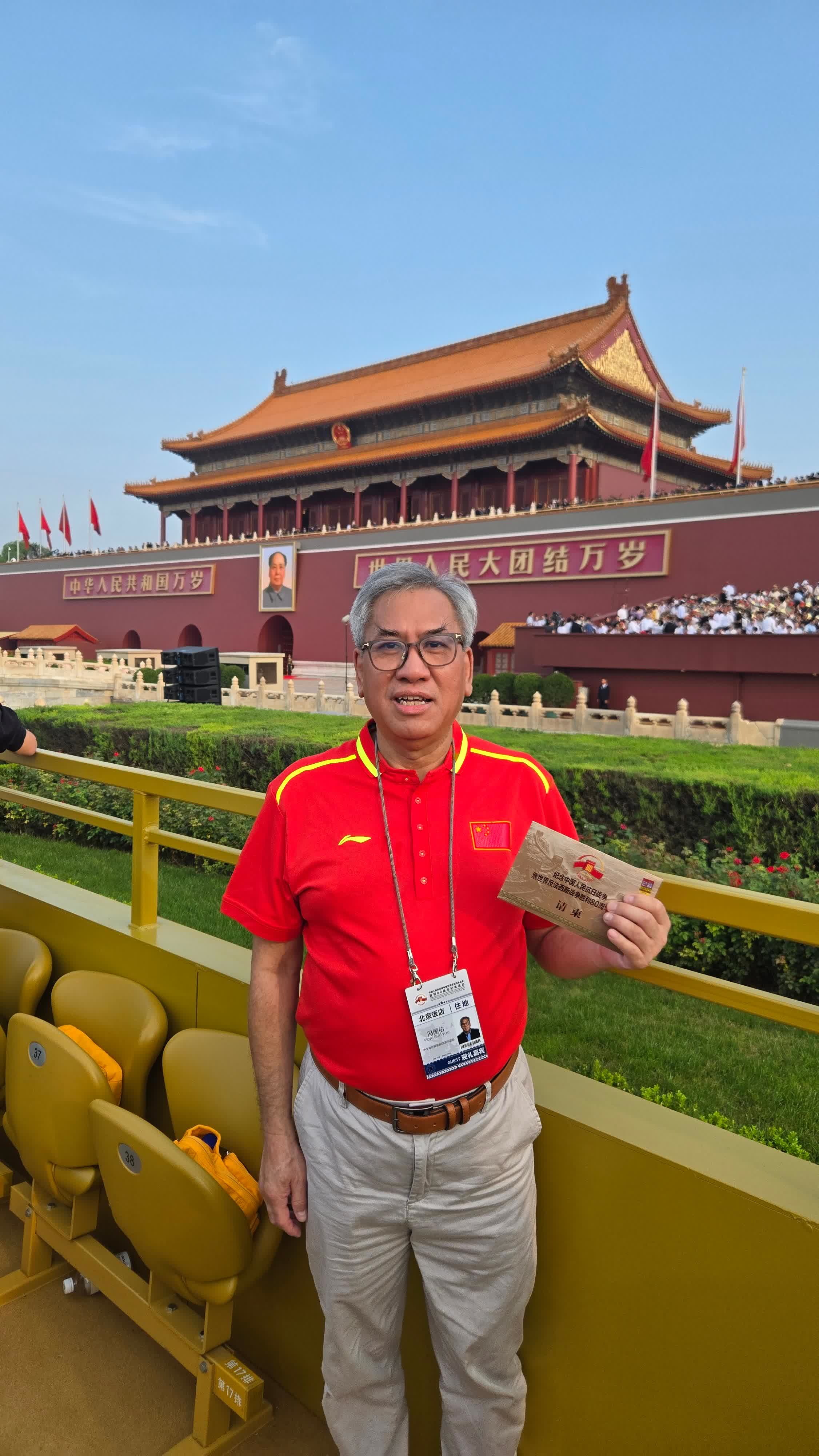「站在天安門廣場上,我心潮澎湃,身為中國人的自豪感在心中不斷升騰。我為祖國的強大而驕傲,為自己是這個偉大民族的一員而自豪。」馮國佑還表示,「這次閱兵還向世界展示了中國作為大國的責任與擔當,我們始終堅定地走和平發展道路,積極推動構建人類命運共同體,但我們也絕不畏懼任何挑戰,我們有能力、有信心捍衛國家的尊嚴和人民的幸福。」