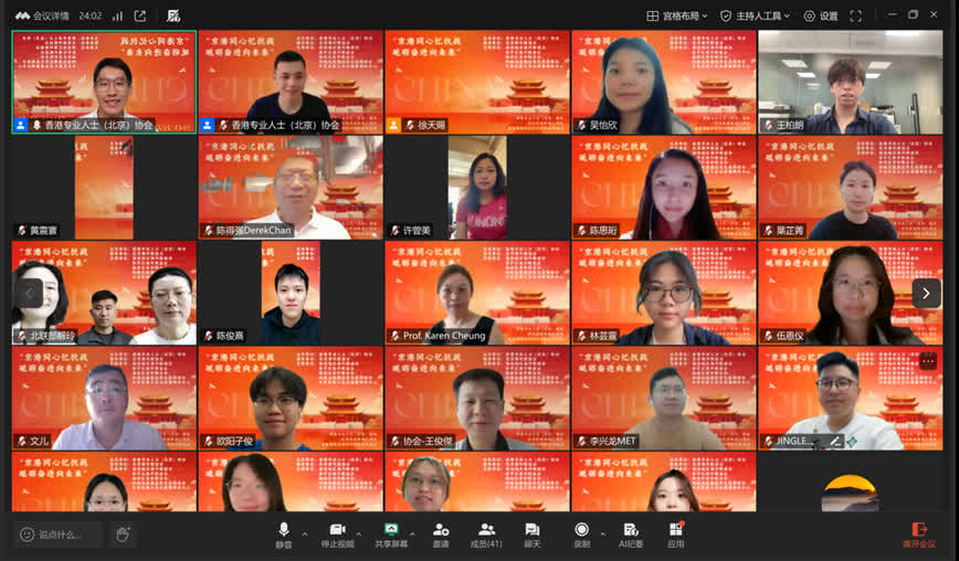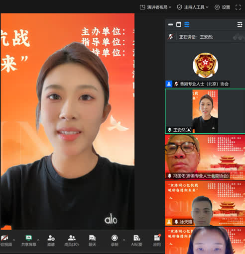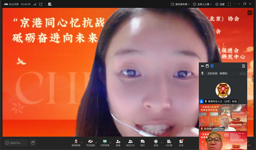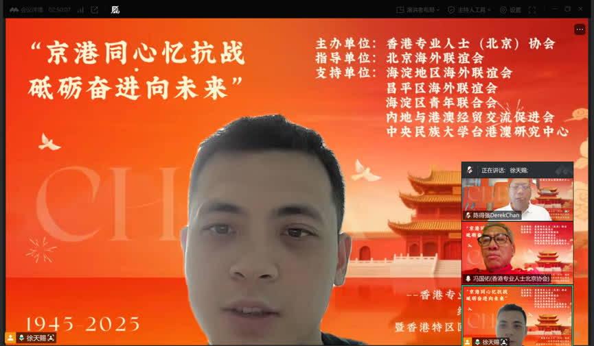 【香港大公文匯全媒體記者張寶峰北京報道】九三閱兵,舉世矚目。中華雄兵,威鎮寰宇。盛大的閱兵儀式後,場內外的香港同胞無不心情激動,他們都為祖國的強大而自豪。為深切緬懷先烈、銘記歷史,進一步弘揚愛國精神、凝聚香港同胞的愛國力量,「紀念中國人民抗日戰爭暨世界反法西斯戰爭勝利80周年閱兵線上分享會」日前在北京舉行,活動由香港專業人士(北京)協會主辦。眾多在京港青齊聚雲端,並結合自身經歷暢抒感言,交流心得。