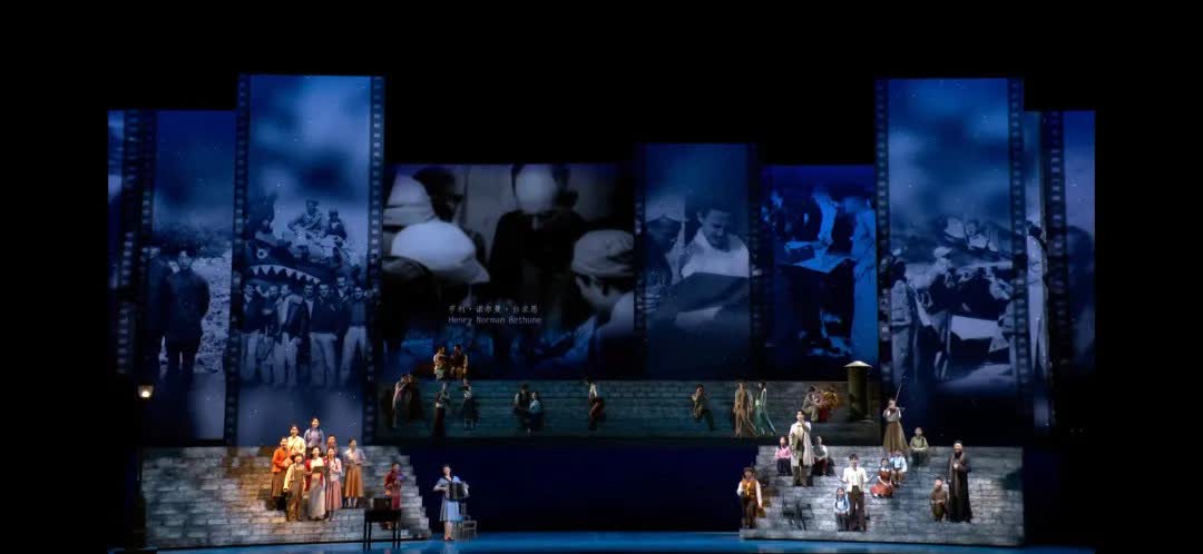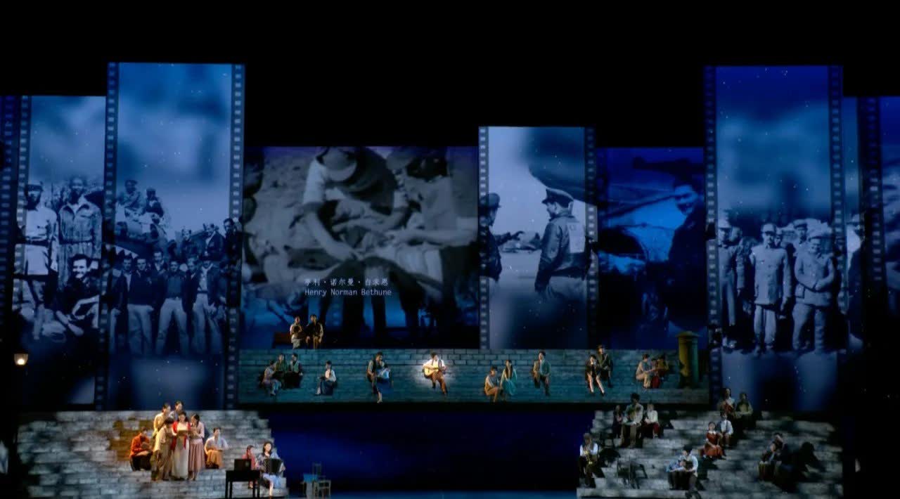 歌曲《紅河谷》中,八路軍總政治部電影團(又稱延安電影團)成員吳印咸當年現場拍下的白求恩大夫手術場景呈現在觀眾面前,與現場演職人員的表演相結合,呈現出更好的舞台效果。