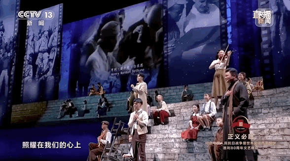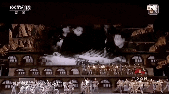 晚會中還有不少類似的場景,而這場晚會的一大亮點就是將虛擬舞台背景與歷史真實影像相結合。演出背景中呈現的一段段珍貴歷史影像,吸引了眾人目光,也把大家帶回到當時的烽火歲月中。