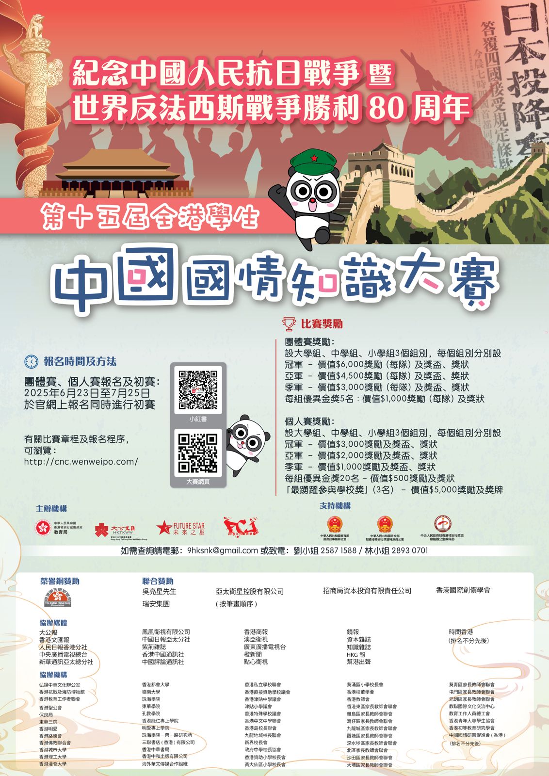 「全港學生中國國情知識大賽」已成功舉辦14屆。2024年,大賽團體賽和個人賽共收到220間學校報名,參與學生逾8000人。今年大賽以抗戰勝利80周年作為主題,同時涵蓋中國歷史(包括香港本土歷史)、地理、文化、文學、軍事、航天、經濟、時事、體育和發展成就等。截至7月23日初賽結束,參與答題的大中小學團隊共計200多支,來自250多所學校的近9000名學生參賽,是歷年來最多學生報名參賽的一屆,很好地促進了全港學生了解黨史國情,學習中華優秀傳統文化,鑄牢中華民族共同體意識,有助培養更多擔當民族復興大任的時代新人。