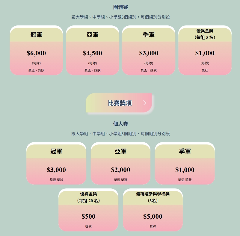 據介紹,複賽之後的決賽中,個人賽和團體賽均分為小學組、中學組以及大學/專上學院組,各組別分設冠、亞、季軍。個人組冠軍均可獲得獎金3000元,亞軍均可獲得獎金2000元,季軍均可獲得獎金1000元;團隊賽冠軍每隊可獲獎金6000元,亞軍每隊可獲4500元,季軍可獲3000元。