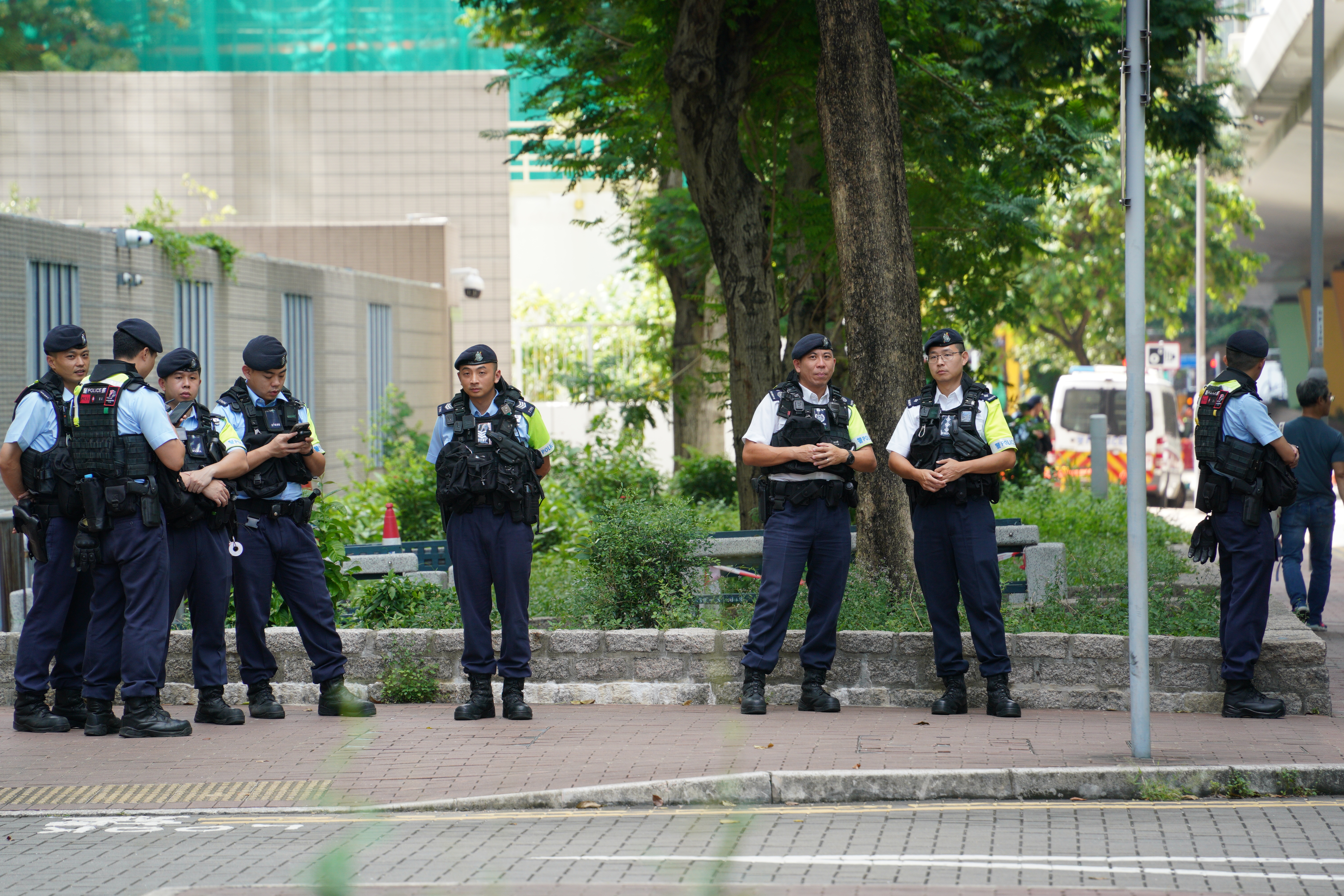 下午2時20分,旁聽人員陸續進場,法庭職員開庭前再次宣讀法官指示。下午2時24分,身穿深藍色襯衫的黃之鋒被3名懲教人員押解到庭。